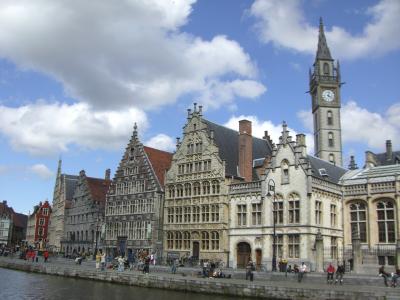 ゲント到着。バス降り場から市街地へとしばし歩く。お天気が回復して綺麗な青空が広がったせいもあってか、古いながらに明るくてイキイキとした街と直感。チューリップの咲く広場の向こうに聖堂と鐘楼が見えてきました。