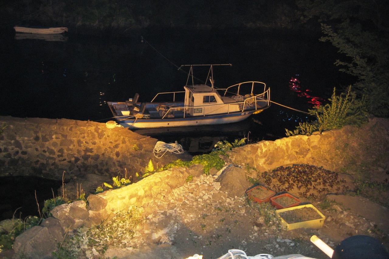 『龍淵夜帆』の月の代わりに、白い明りが水面に映っています。澄んだ水は変わりがないようでした。