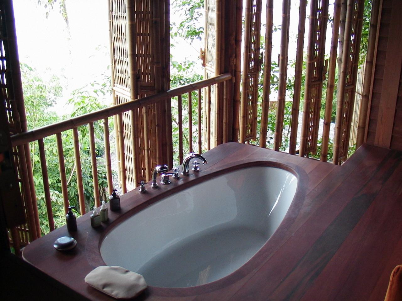 ゆったりサイズのバスタブ。竹でできた扉を開ければ、オープンエアー!きっと、湯上がりに外の景色を眺めながらゆったりできるように、ソファーがあったんですね!(お湯はちゃんと出ましたが、給排水にちょっと時間がかかりました。)