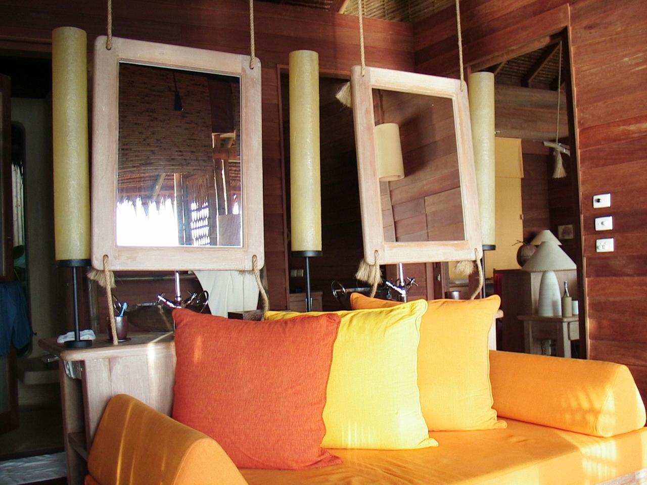 洗面台の後ろ側。鏡はこちら側にも。このソファー(どうしてここに?)の前にバスタブがあります。