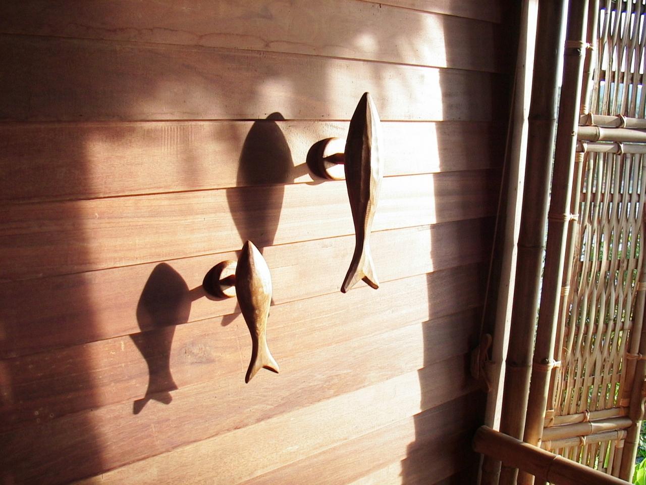バスルームの壁には、魚の形をしたフックがついてました。