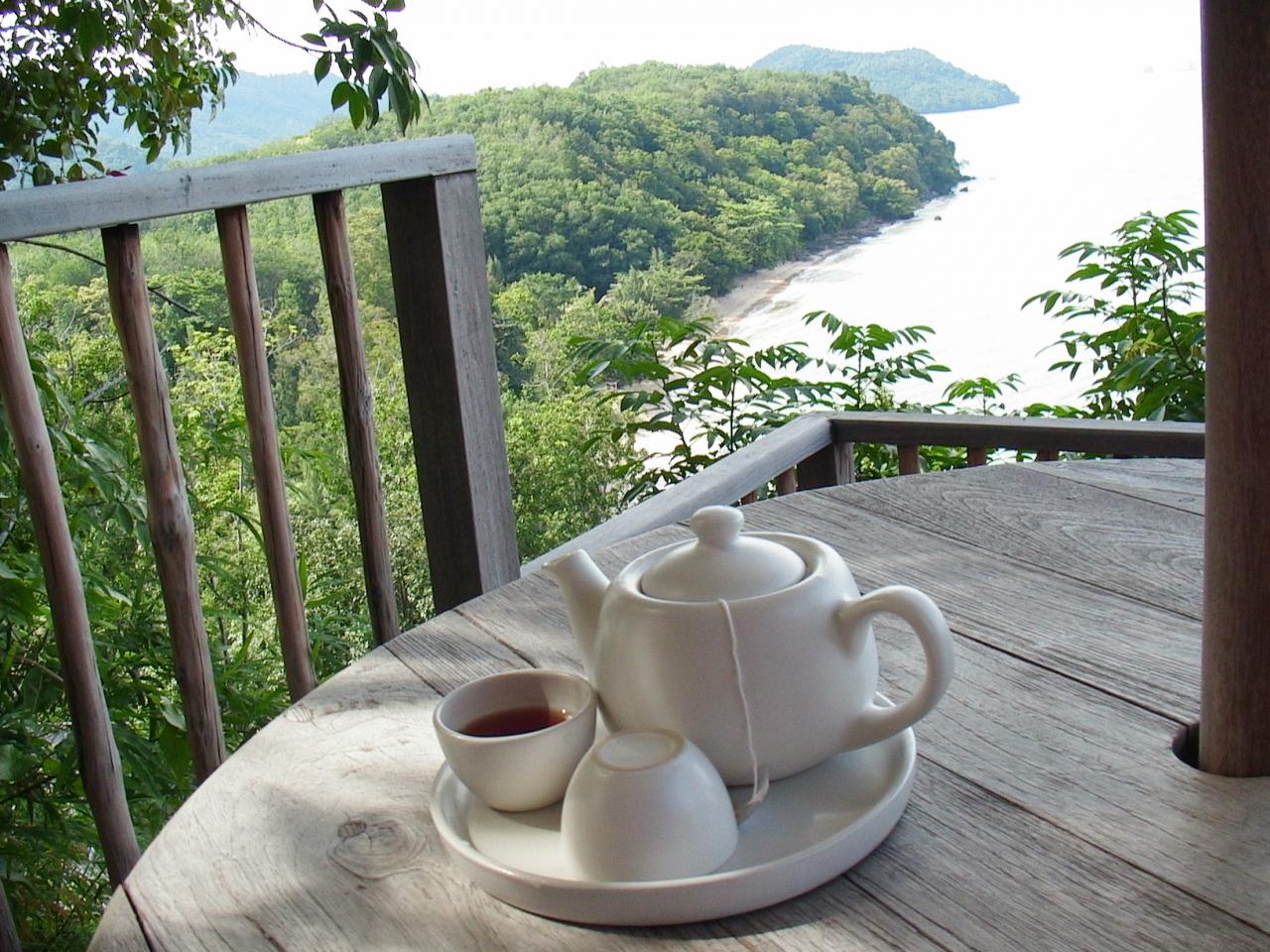 ランチはもっぱらこのテラスで。朝食のビュッフェでこっそりもらってきたパンを、エスプレッソや紅茶とともにおいしくいただきました。