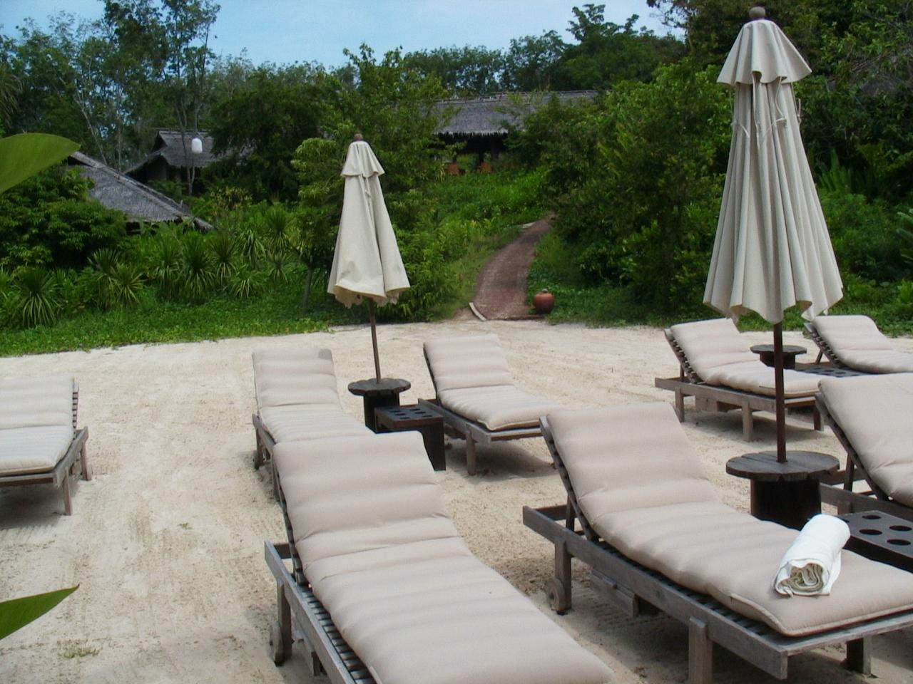 “リビングルーム&テラス”から歩いてすぐのプライベートビーチ。パラソル&ベッドの利用者は1人だけでした。(皆さん、ヴィラからあまり出ないのかも?)