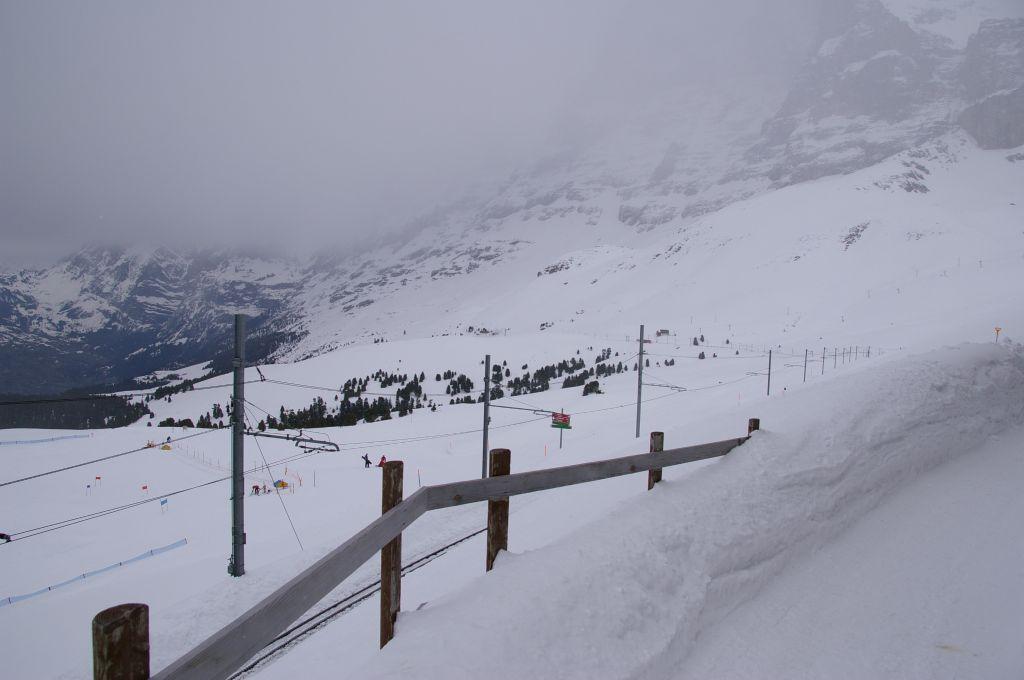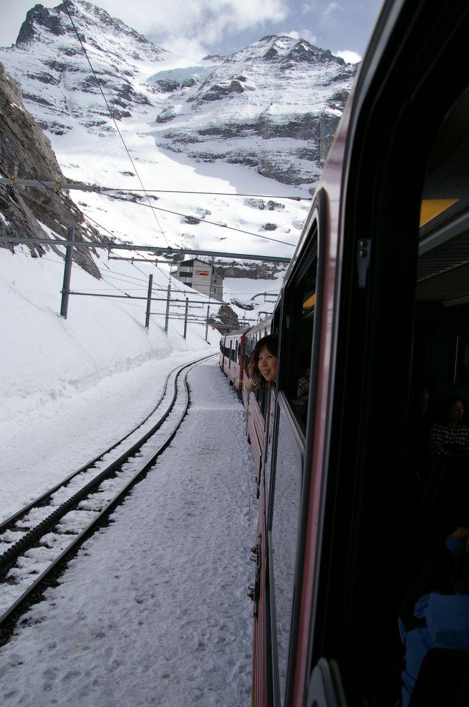 インターラーケンを出発し電車に揺られること約1時間、ラウターブルンネン、WENGEN駅を通り、ユングフラウまであと一時間を残したクライネシャデックに到着。すっかりあたりは雪景色で、スキー客でにぎわっていた。ここはユングフラウ最後のベース駅であり、グリンデルワルドにもいける中継駅でもある。西側にはかの有名なアイガー北壁があり、この豪雪地帯でも雪を積もらせない、急壁が見るものを圧倒させる。