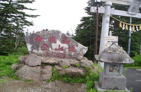 信仰の山だけあって、未明に見た白装束姿の行者さんの数が多い。平坦道を500−600m程歩くと、奥社遥拝所に至る。ここまでは平坦だが、この先真っ直ぐの登山道が垂直に頂上に向って伸びている。身体が不自由な人、或いは冬山で登れない時などは、ここから遥拝するのだろう。以前登った石鎚山にも同じ様な遥拝所が中宮社の前に建っていた。正面に石鎚の尾根があり、その先方に神社奥社があって、遥拝するには最も相応しい場所であったが、ここ御嶽山も同じ様な状況で、奥社を真正面に拝する場所にあった。勿論ここからは社自体が見える訳ではないが、敬虔な気持ちになるには違いない場所であった。