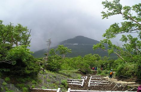 バスの中で暫く仮眠し、5時、辺りが明るくなると同時に登山開始する。今日のガイドは森林局の西村さん。この辺りには詳しく、昨日もトラピックスのツアー客を案内したとのことである。到着した1時間半前は、曇り空でライトの光りが山の中腹辺りまで見えたが、出発の今の時間、霧は更に深くなり、とうとう小雨混じりの霧雨になってきた。皆、雨具を着込んでいるが、当方何を勘違いしたのか、緊急用のツエルトと形が似ていて雨具を忘れてきてしまった。防水用のジャンパーを上に着て、傘を差して歩く。風も無く、雨脚も激しくなく、今のところ傘でしのげそうだ。