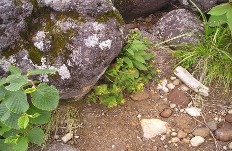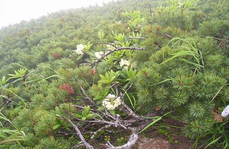 立派な社の大江神社を過ぎる辺りから硫黄の臭いがしてくるが、この霧雨では100m先も見えない。ただ足元の山道と路傍の高山植物の発見に喜びを見出すのみ。この辺りの森林限界は2400m付近。白樺からダケ樺に変わり、五葉松は這い松に変わって、石ころだけの山道になる。