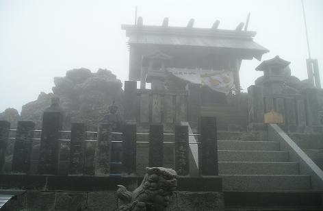 唐松草、御前立花、コイワカガミ、マイズル草、こけもも、等を観察しつつ、9合目石堂を過ぎた頃より硫黄の臭いが強くなり、頂の稜線が霧の中にうっすらと現れ、山頂小屋のヂーゼル音が遠く響いて来る。残り30分、漸くにして王滝頂上、2936mに到着する。ここには大きな施設の頂上山荘と王滝神社が鎮座している。