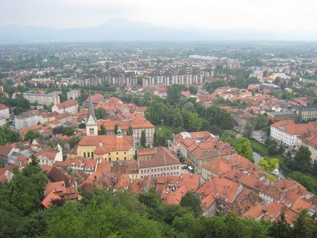 その後、プレチニクの作品、竜の橋を見て、リュブリャナ城へ。ここはリュブリャナの街を一望できる小高い丘の上に立つ。歩いても登れるが、時間が限られているので、3ユーロ払ってケーブルカー利用とする。城に着き、さらに城のてっぺんまで登るには3.5ユーロ払う必要がある。迷わず、てっぺんへ。 メタボ気味の体にはややきつい螺旋階段を登ると、リュブリャナの街を一望だ。生憎の天候のため、アルプスの山並みは見られなかったが、オレンジ屋根の家々が並ぶ、いかにもヨーロッパの街並みを見ることができた。なかなか去りがたく、20分くらいぼぉーっとする。この城では、30分おきにリュブリャナ城の歴史を見せる映像を流している。翻訳機とヘッドフォン、それに立体的に見せるめがねなども配られる。案の定、翻訳機には日本語ヴァージョンは無し。英語翻訳で聞くが、疲れも溜まっており、半分くらいうとうとしてしまった。
