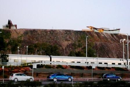 手前には『インディアン・パシフィック』号、山の頂上には記念館が。
