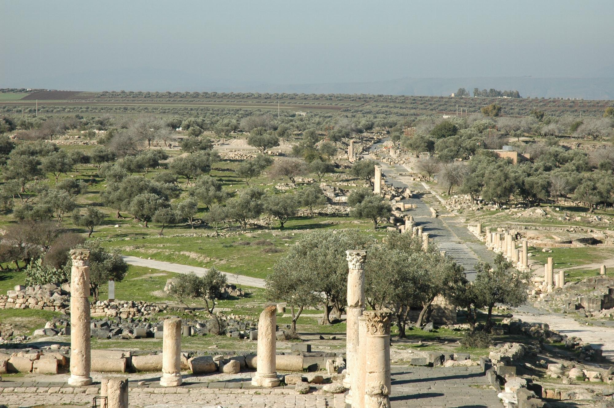 ウムカイスに向けて北上する途中より、遥か左奥はシリアの町ダラーとのこと。