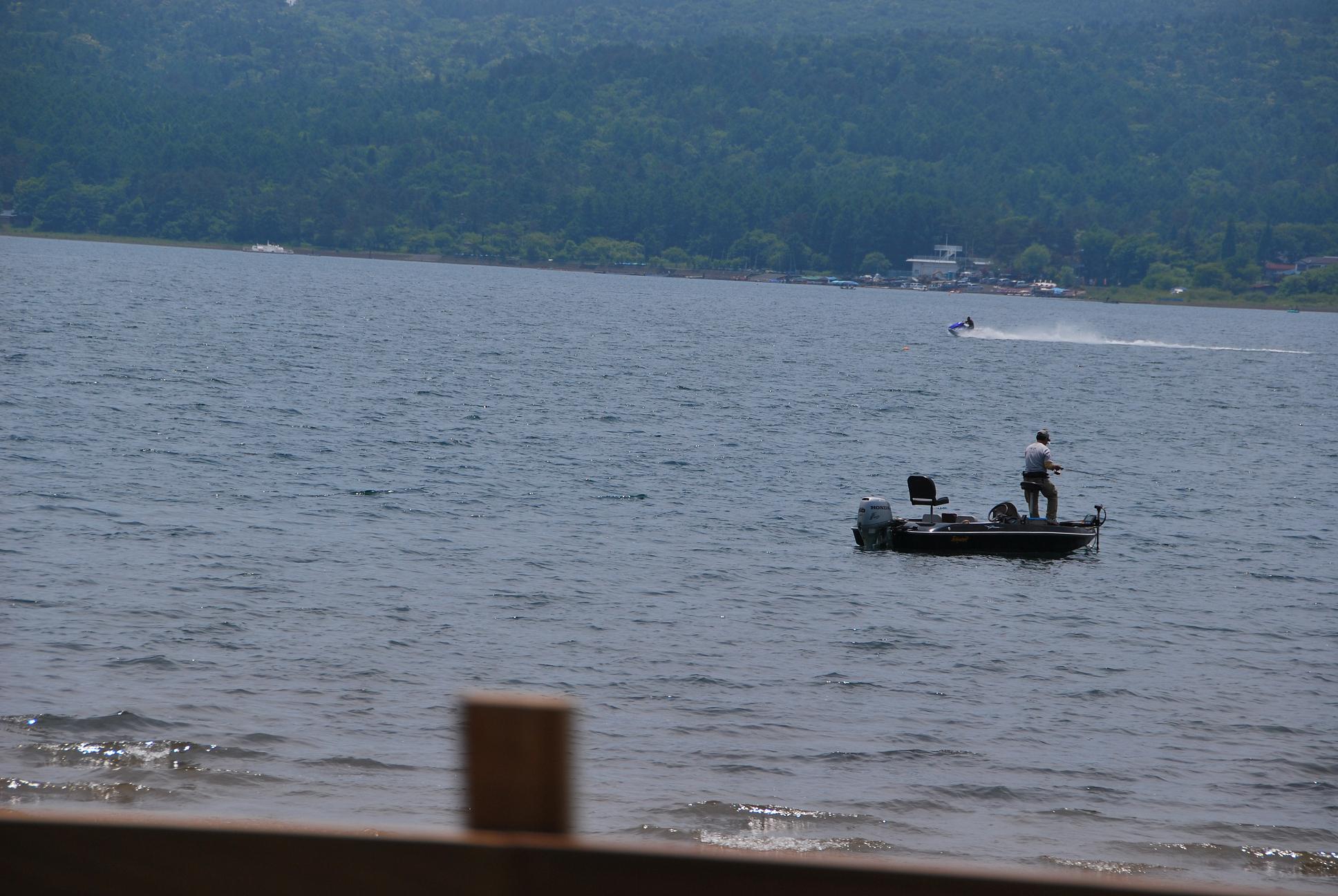 山中湖湖畔では、釣りをしている人もいます。