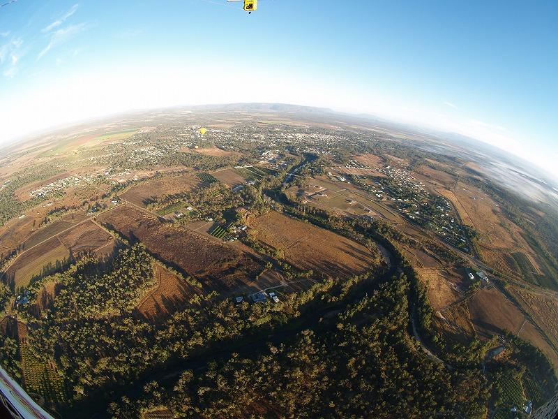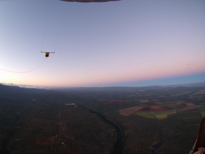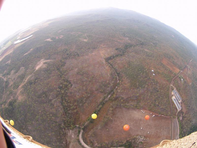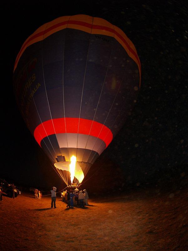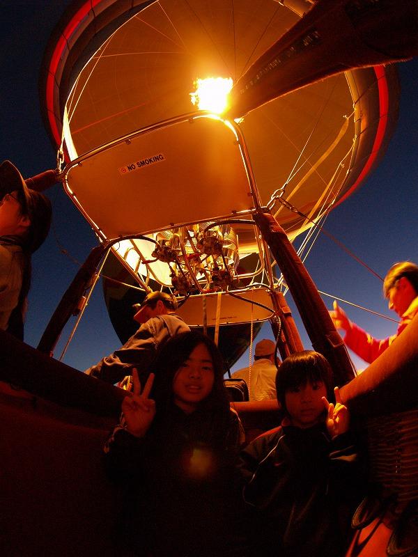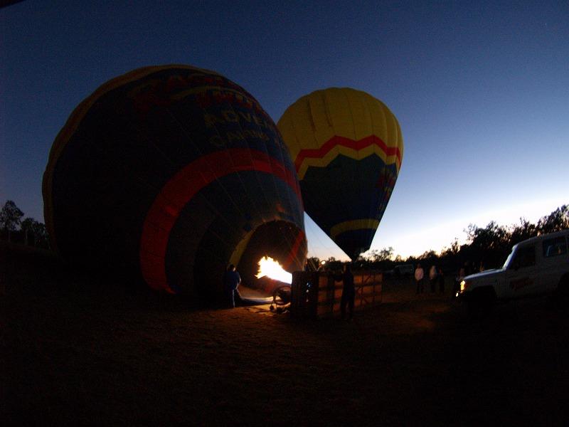 ケアンズを早朝4時に出発し、キュランダ高原を越え、熱気球の発着場所に向かう。日の出前に到着すると、すでに気球がふくらみ始めていた。轟音と共に暖められた空気が送り込まれ、どんどんふくらんでいく気球。そして、いよいよ搭乗。巨大な気球は20人乗り。バスケットが4つに区切られ、1つの枠に5人ずつが搭乗する。ロープがはなされ、ぐんぐんと上昇。あっというまに高度1500mに到達。その後朝日が昇るのを感動しながら見て、ゆっくりと高度を下げ始めた。約30分後、いったん地上に降り立ち、その後搭乗者を入れ替え、再び上昇。私たちは1時間コースを申し込んでいたので、2回乗ることになりました。