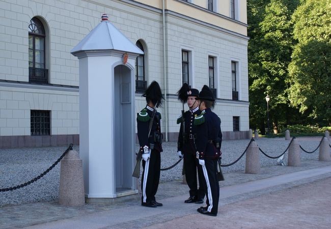 芝生と反対側に王宮の建物があって、衛兵さんがゆっくり歩いている。