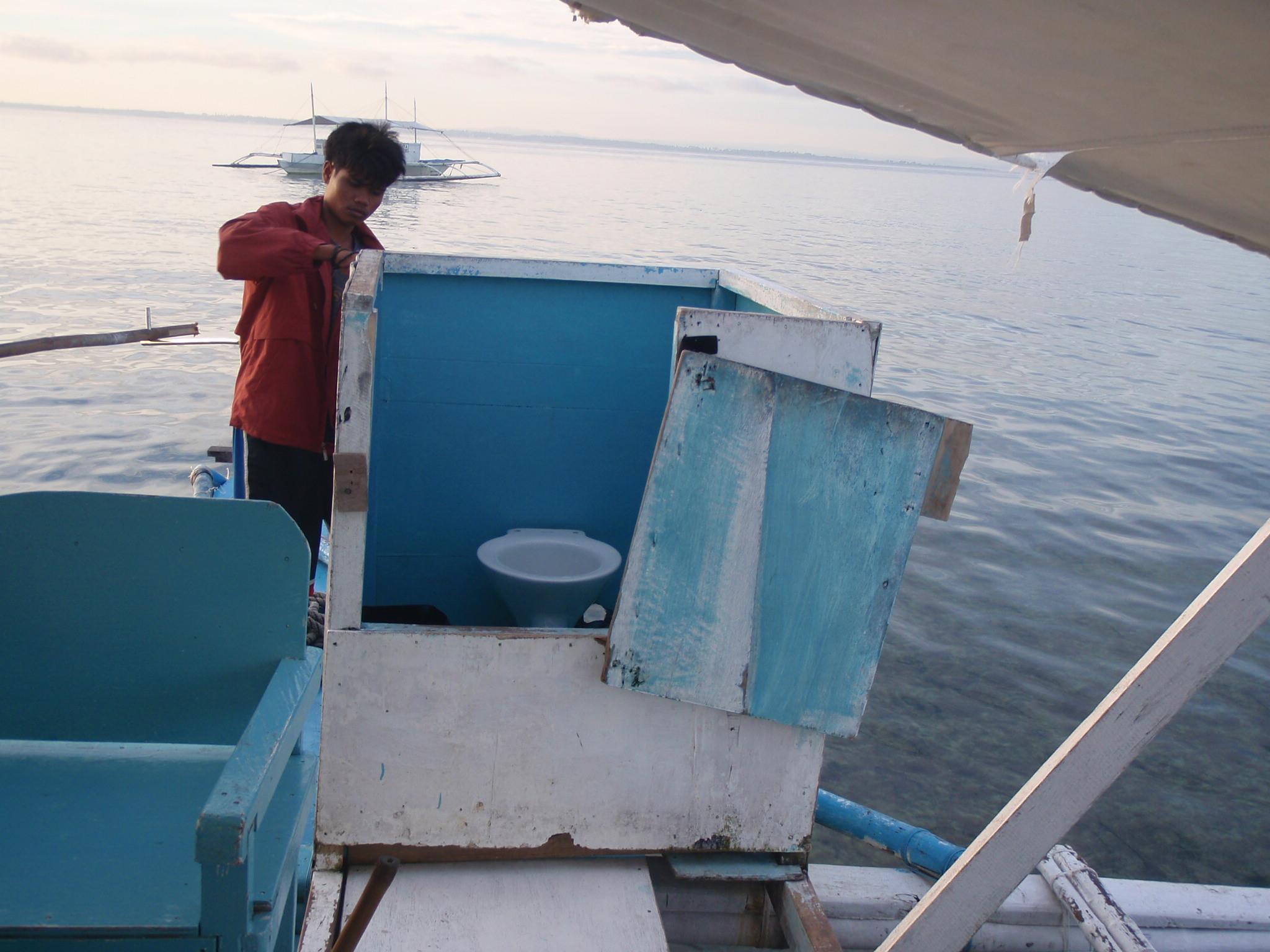 船のトイレはどの船でも大差無いらしく、囲い&便器(便座なし・トイレットペーパー無し)雨の日と大便には多少支障がありますねw