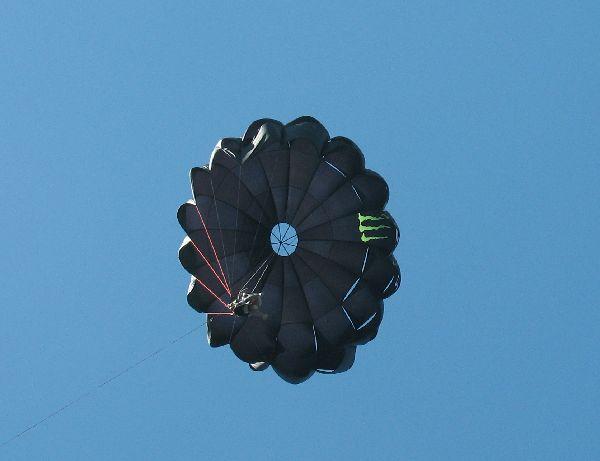 青い海と紺碧の空と華やかなパラセーリングの様子。