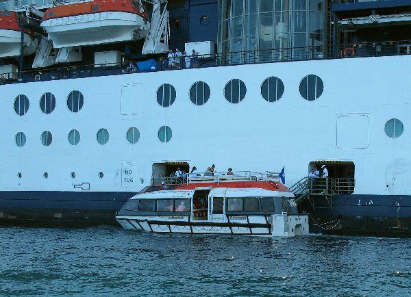 テンダーボートから下船は揺れて危ないので皆慎重です。