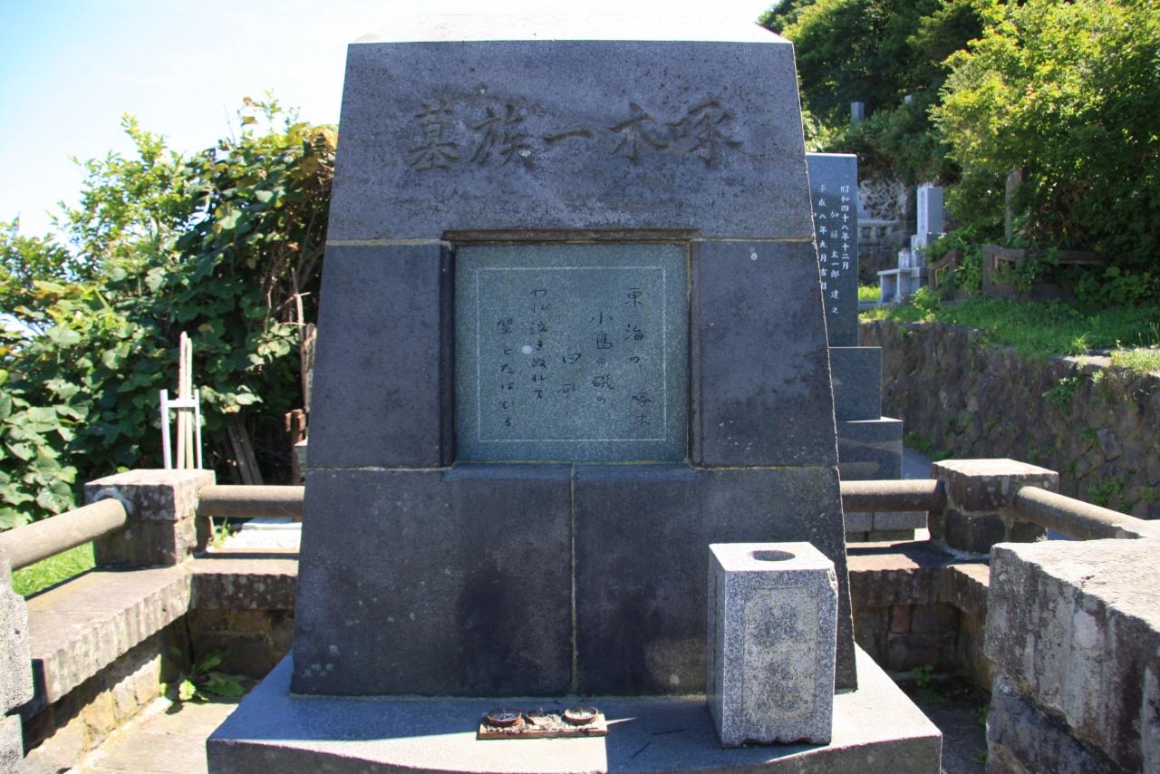 墓石には「東海の小島の磯の白砂に われ蟹とたわむる」の歌が刻まれています。