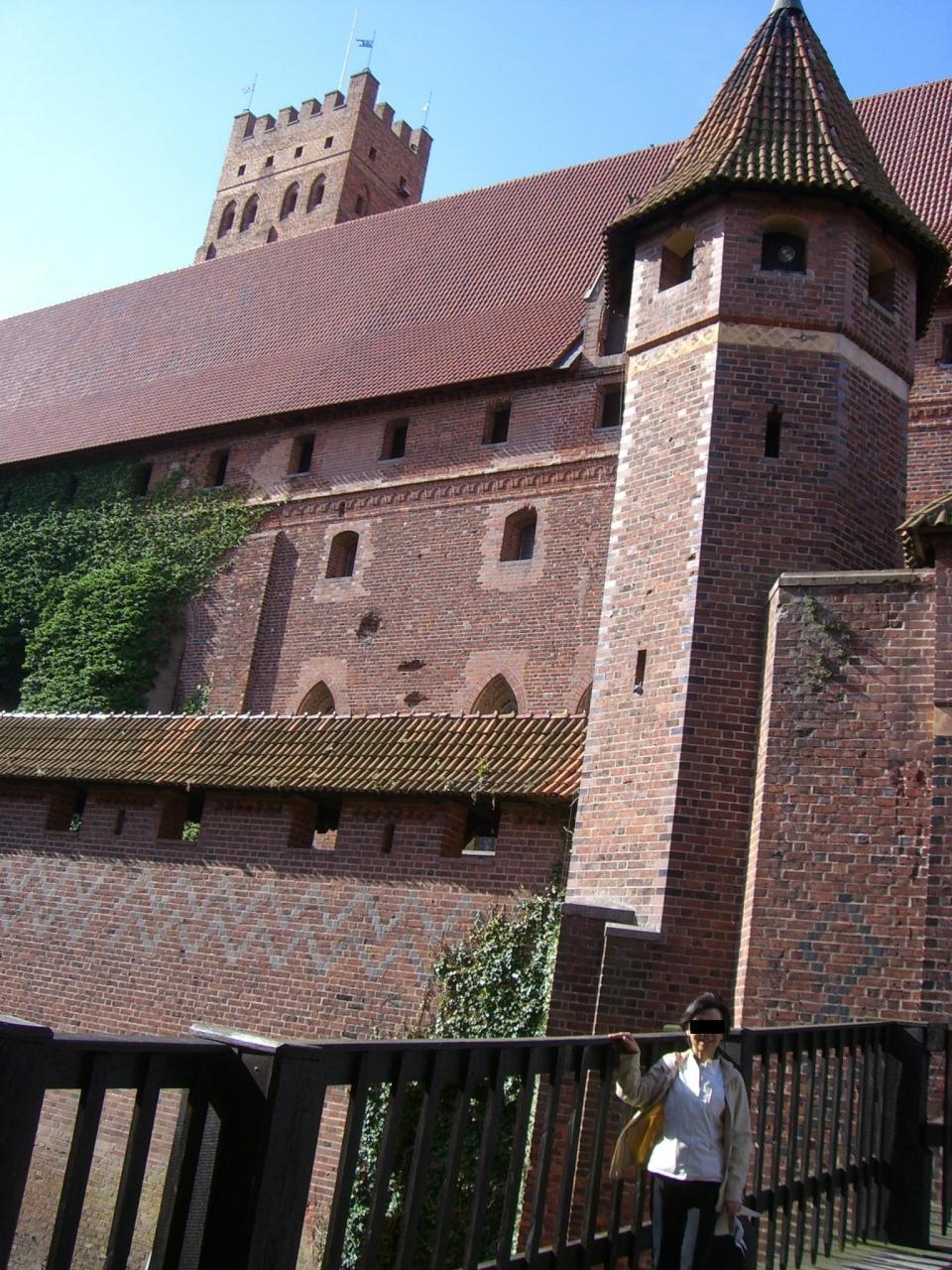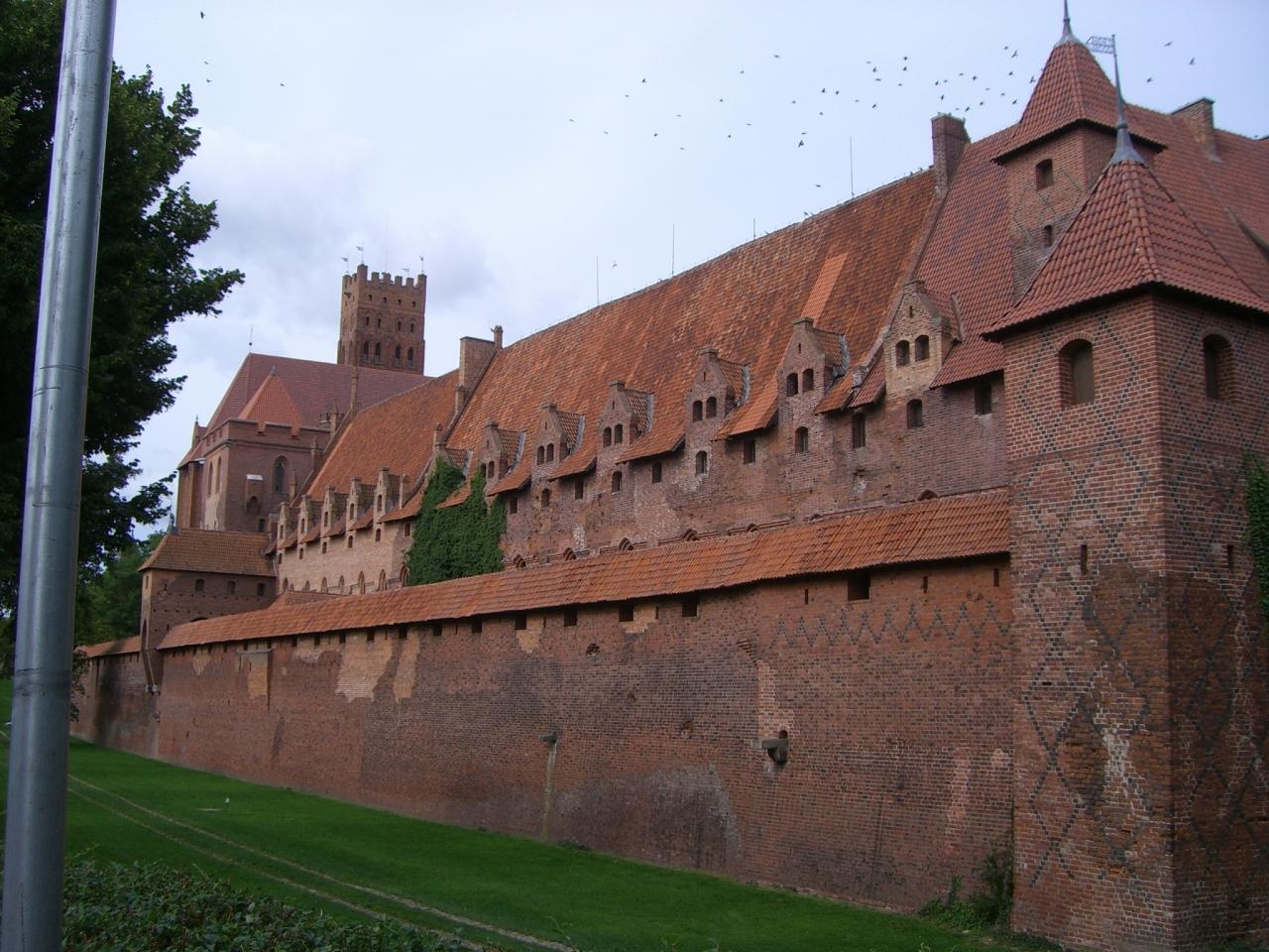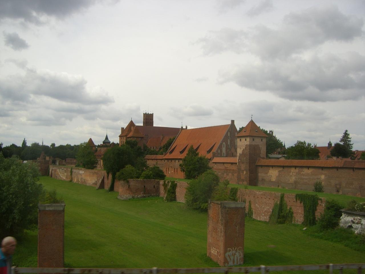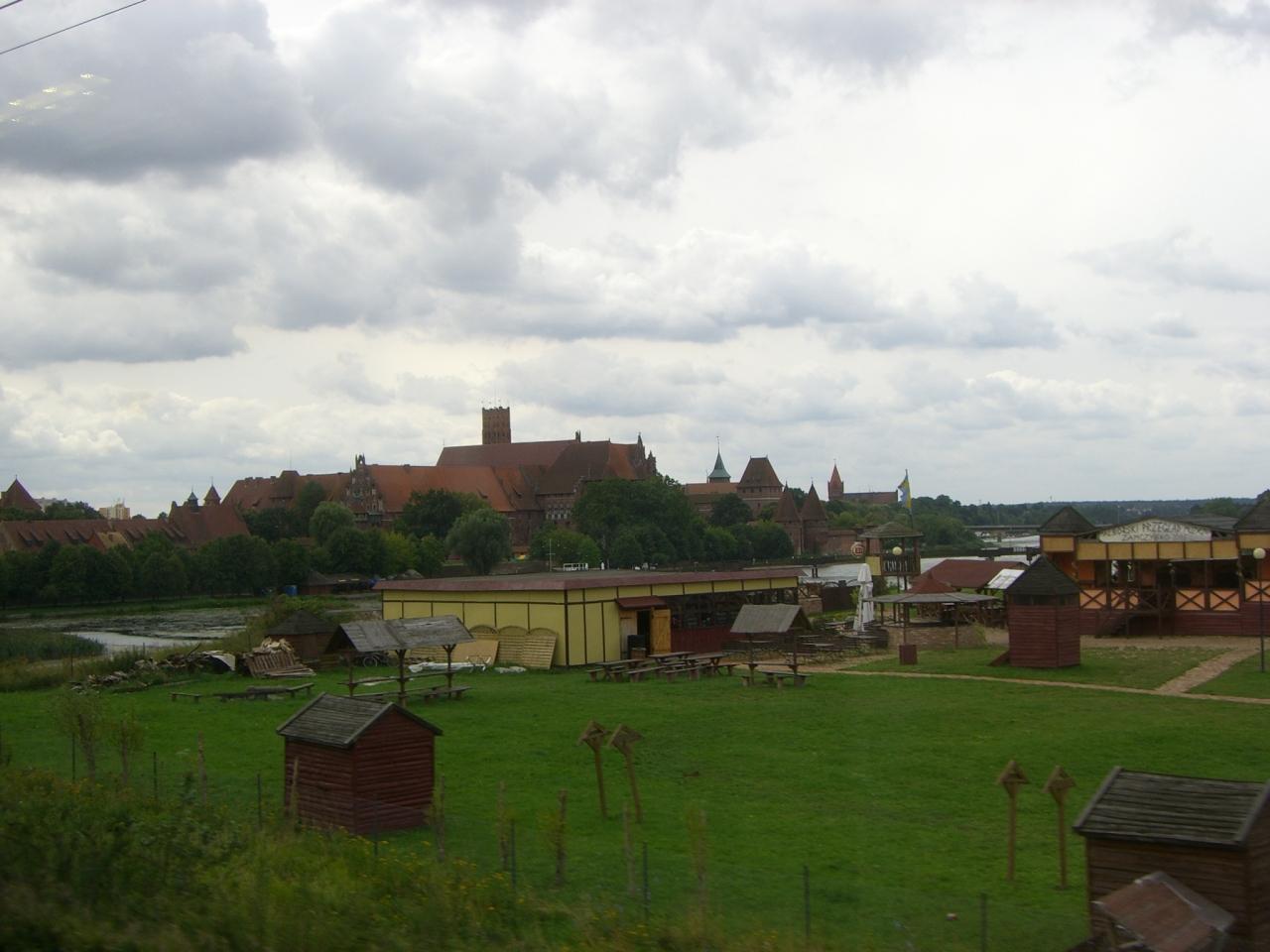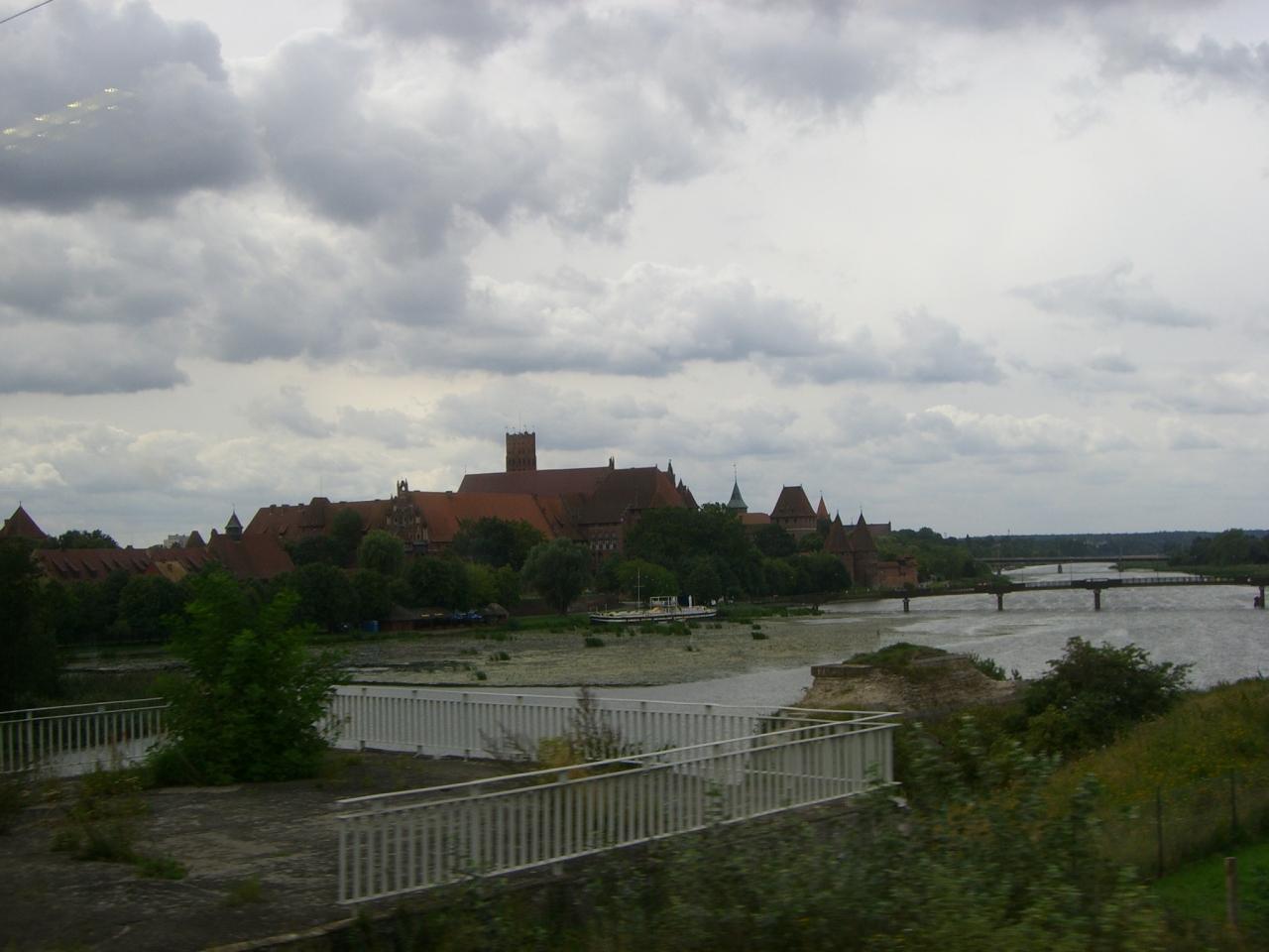 帰りの列車内よりマルボルクのドイツ騎士団の城を見て。マルボルク城はドイツ騎士団のバルト海沿岸地方征服の拠点として1274年に建築された要塞。ポーランドとドイツ騎士団の争いの中ドイツ騎士団はマルボルク城に立てこもったが第一次トルニ和平条約で騎士団はポーランド王の支配下に入り城はドイツ騎士団の居域として認められた。しかし、1453年に再びポーランドと戦争になり1457年に城はポーランドに明渡された。1460年頃からは歴代のポーランド王が地方を訪れる際使用され増改築がなされた。城は3つの城が組み合わさって出来ている煉瓦造りの大きな城となっている。マルボルクの町は1871年にはドイツ帝国の支配下に入り、城は第2次世界大戦で随分破壊されたがポツダム宣言によりポーランドに復帰した。