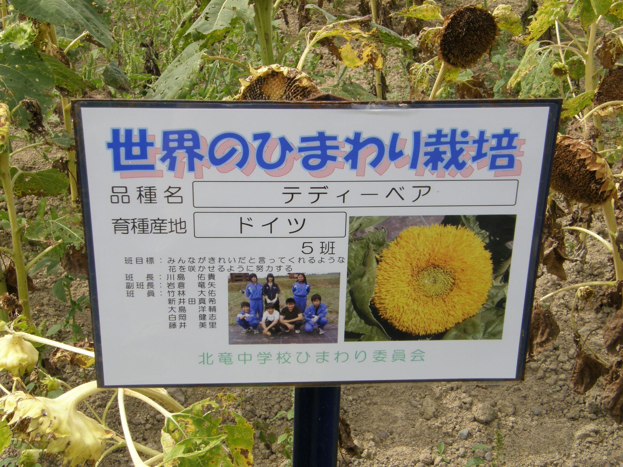 北竜中学の皆さんが世界の30種類のひまわりを育てたそうです。枯れてしまった種類は立て札の写真を撮りました。全部は見れなかったのですが、種が飛んでしまうのか、混じっているようです。