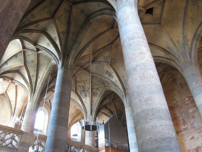 サンモリッツからシュクオル行きの電車に乗り込み、途中の駅、ツェルネッツで降りました。そこから、スイス国立公園を通り、ミュスタイアに行くバスが出ています。バスに乗って、約1時間で、「聖ベネディクト会修道院」のあるミュスタイアにつきます(降車は、「Muestair, Clostra son jon」、muestair, postの次の駅です)。教会の内部のフレスコ画。かなり古そうなフレスコ画が、天井まで描かれています。
