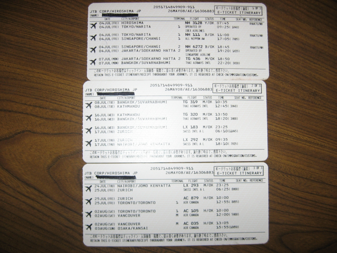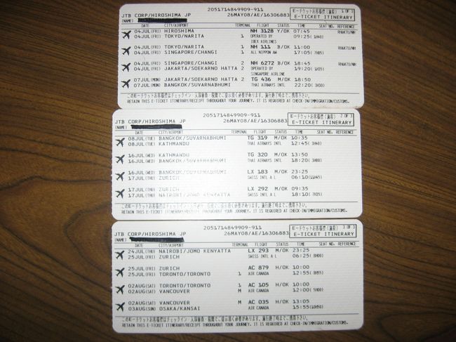 今回の国際線の搭乗券半券です。ルートは、広島〜成田〜シンガポール〜ジャカルタ〜バンコク〜カトマンドゥ〜バンコク〜チューリヒ〜ナイロビ〜チューリヒ〜トロント〜バンクーバー〜関空〜台北〜香港〜ジャカルタ〜香港〜関空です。広島から関空まではスターアライアンスの世界一周チケットを利用しました。そして、一旦帰国後の関空−インドネシアは、ワンワールドメンバーのキャセイ・パシフィック航空です。こうして書いてみると、結構飛行機に乗ってます、、、、、、。