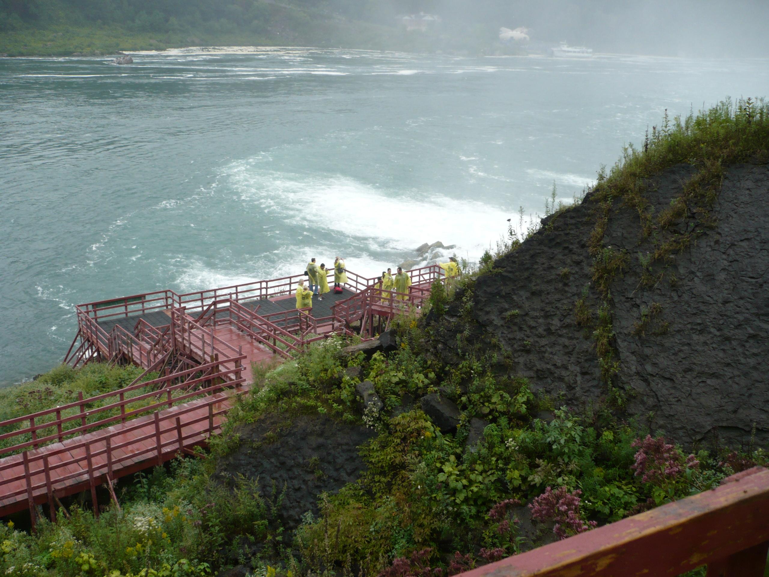 風の洞穴に入る為の切符を購入、黄色いカッパとサンダルをもらい、売り場の後ろにある石造りの建屋に移動そこからエレベーターで滝壺へ、トンネルを通り遊歩道を通りデッキに、そこからがナイアガラを体で感じるメインエベント、ここに来なければモッタイナイ。