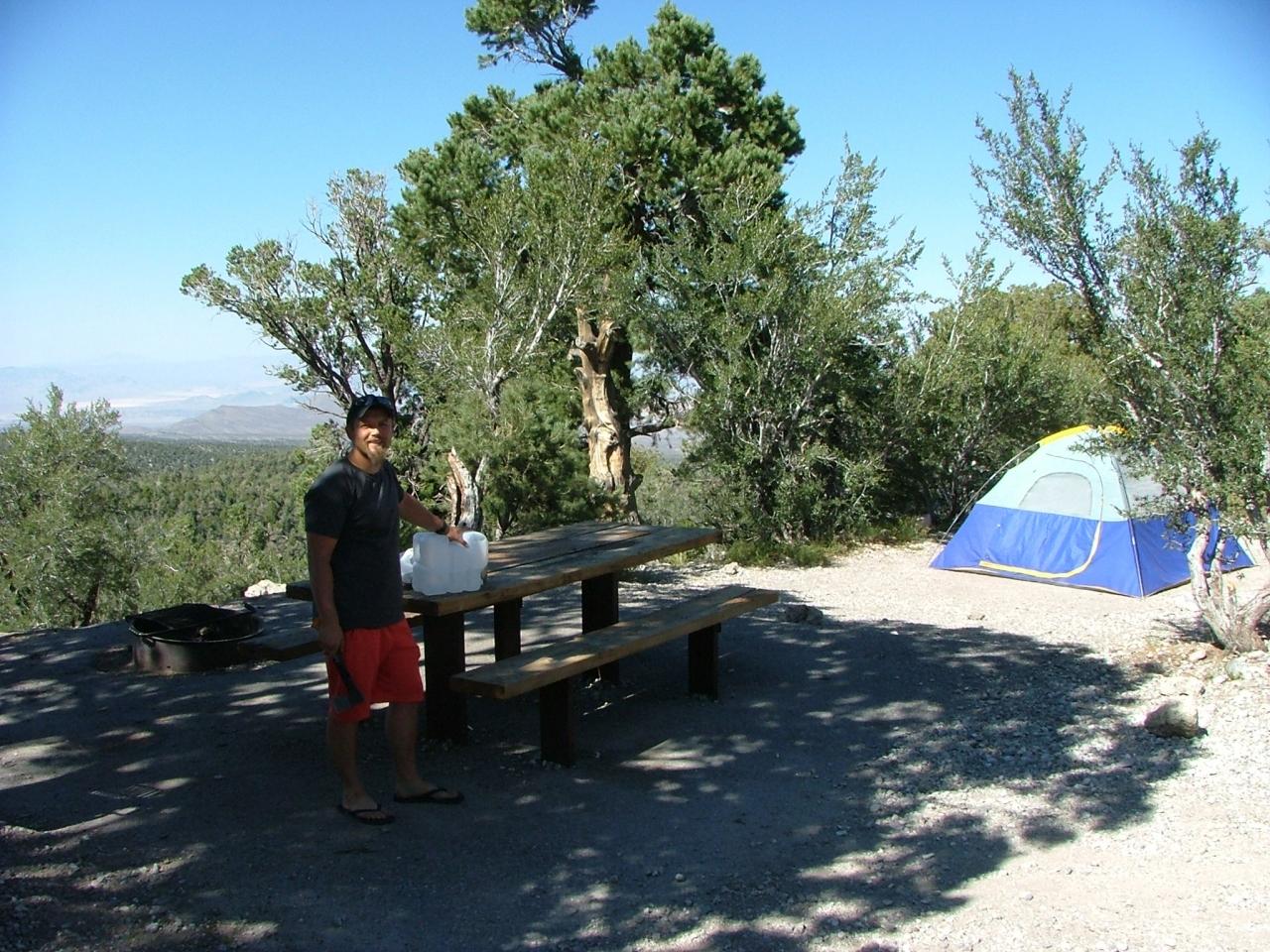 この地域には数ヶ所キャンプ場があります。私達は全部をまわり、一番景色のよいヒルトップキャンプ場を選びました。私達のサイトからは自然を見下ろす風景ですが、すぐ隣のサイトからは夜ラスベガスのネオンが見えました。 -