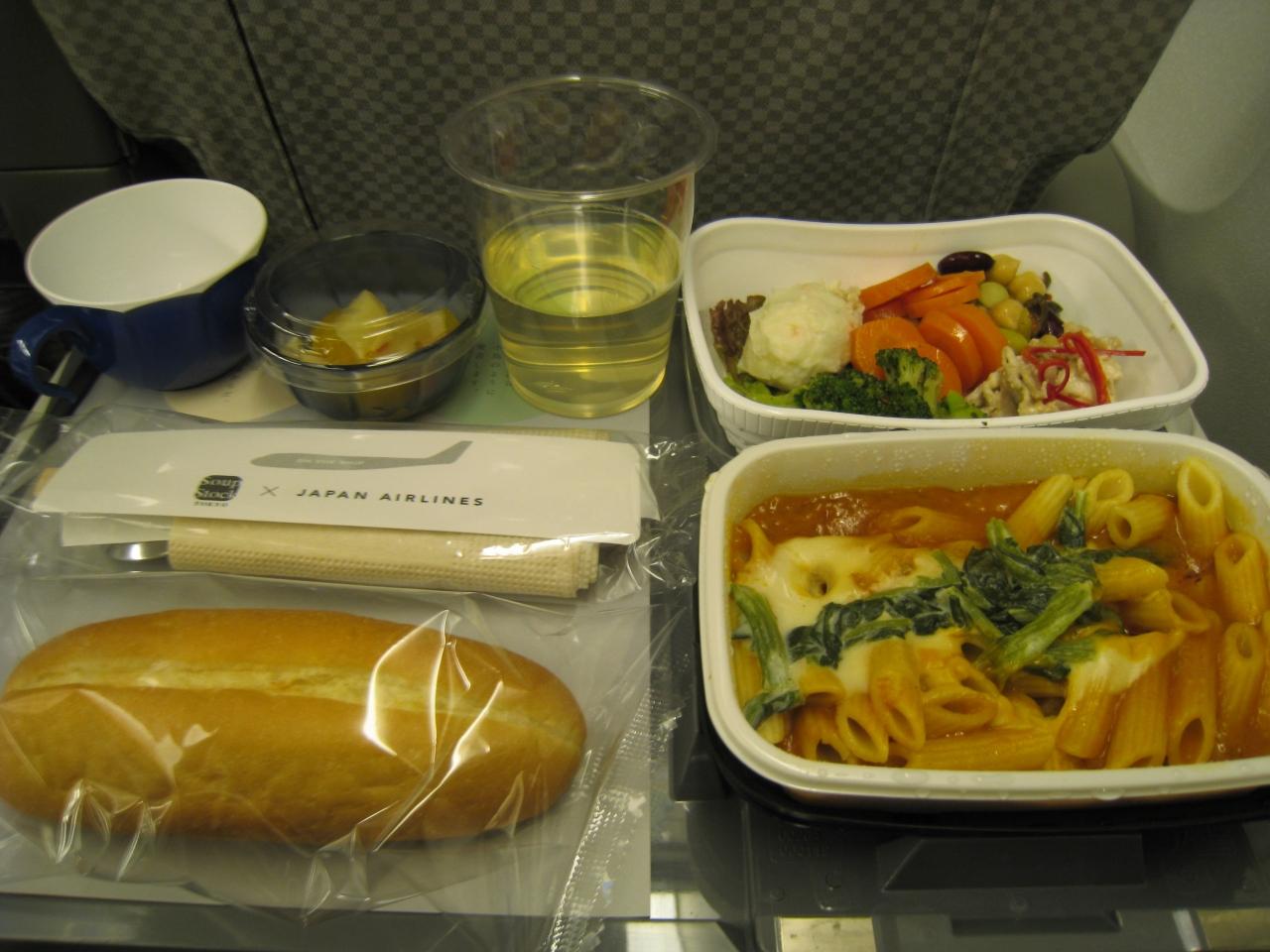 さて、機内食ですが、オマールエビソースのパスタはエコノミーの機内食としては合格です。とてもおいしゅうございました。ちなみにメニューはこれ1つです。 -