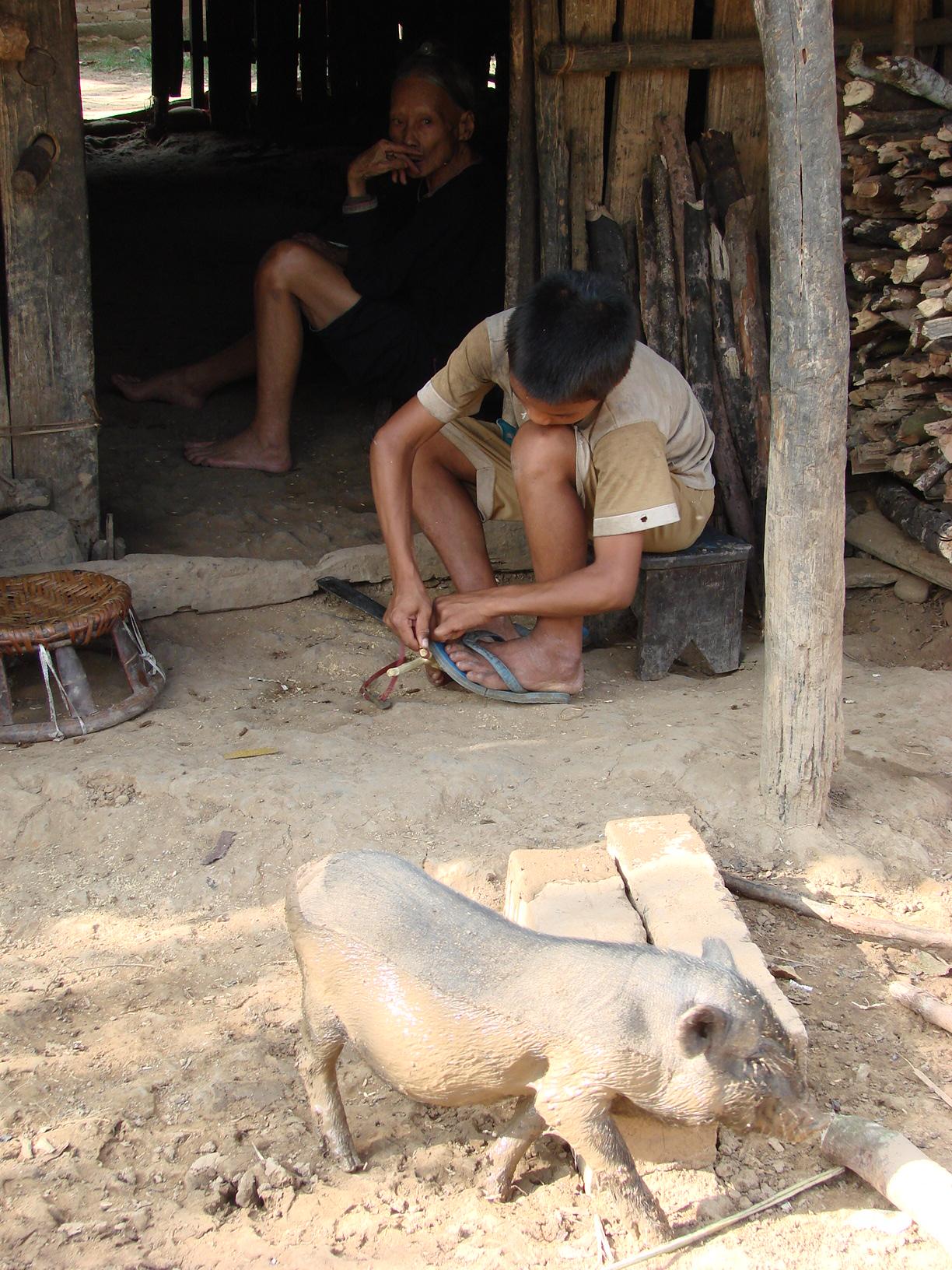 母親は屋内の日陰で、子供はゴム銃作りに余念がない、子豚は体に泥を塗りつけている、それぞれの時間が今日も流れて行く。