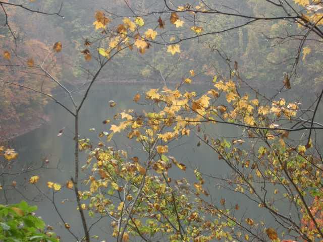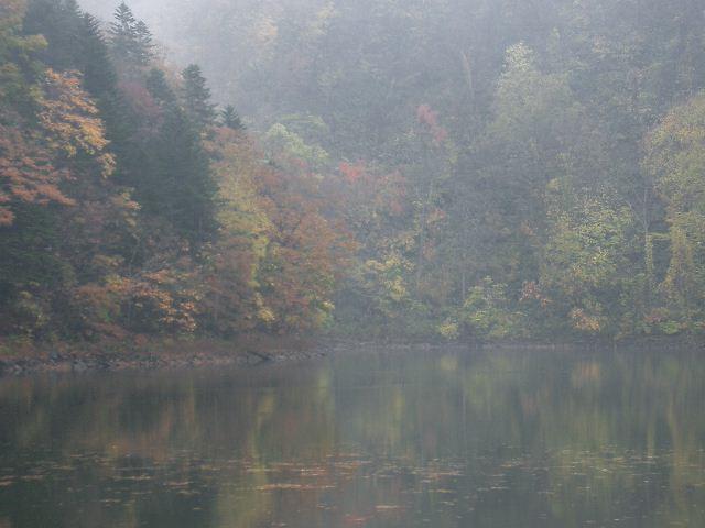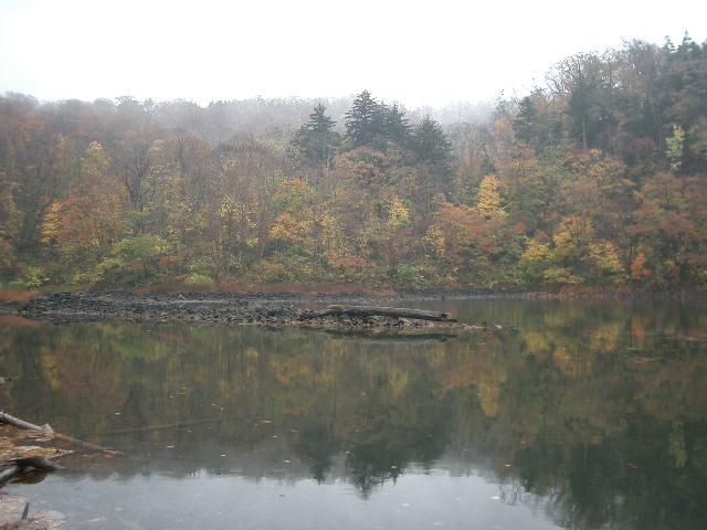 羊蹄山に西山麓の半月湖は奥まった静かなところです。駐車場から落ち葉に埋まった山道を歩き、湖岸まで降りて秋を満喫しました。とてもよい湖です。