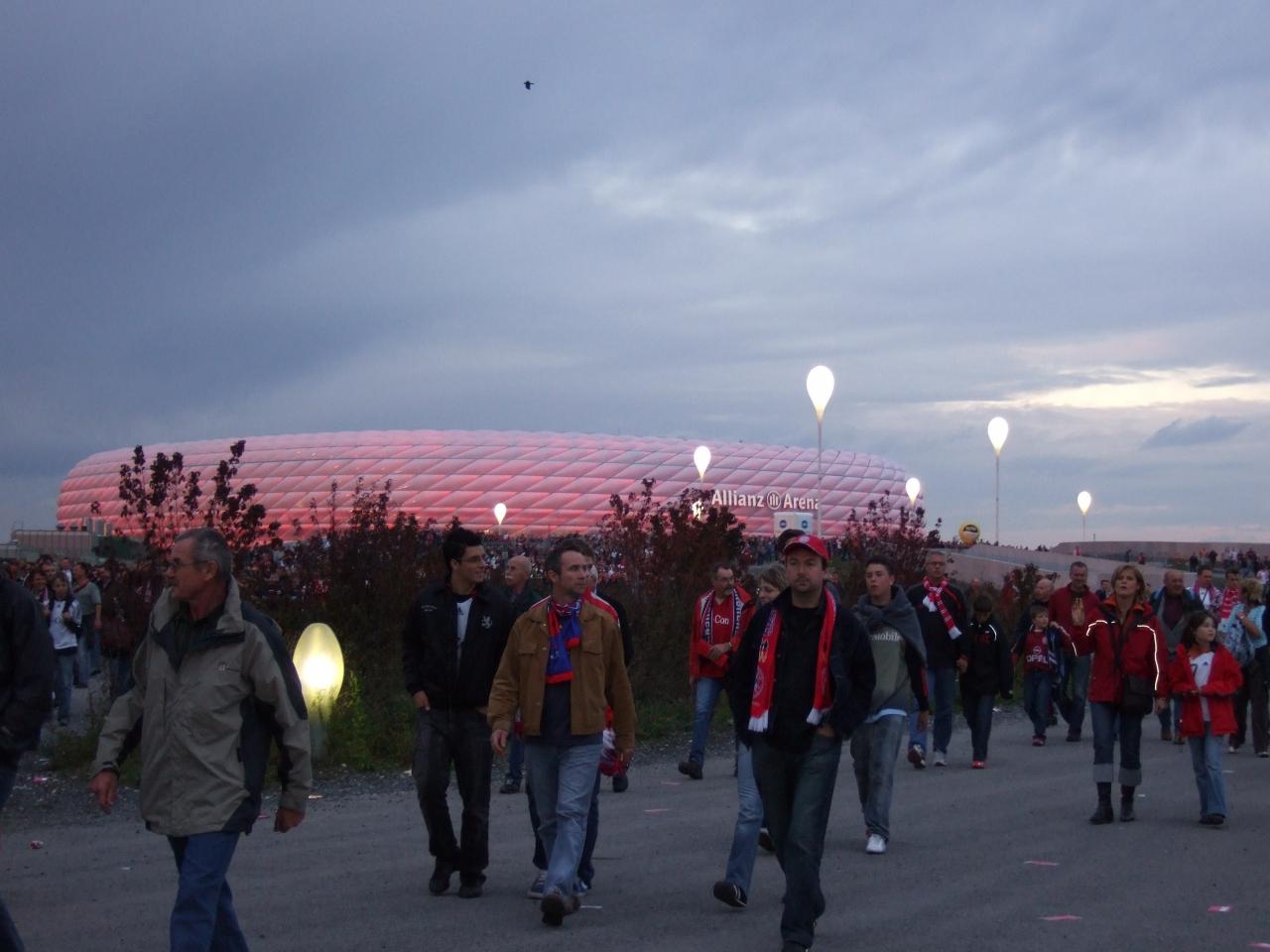 試合終了後、スタジアムを振り返るとバイエルンカラーの赤色にライトアップされ始めておりました。