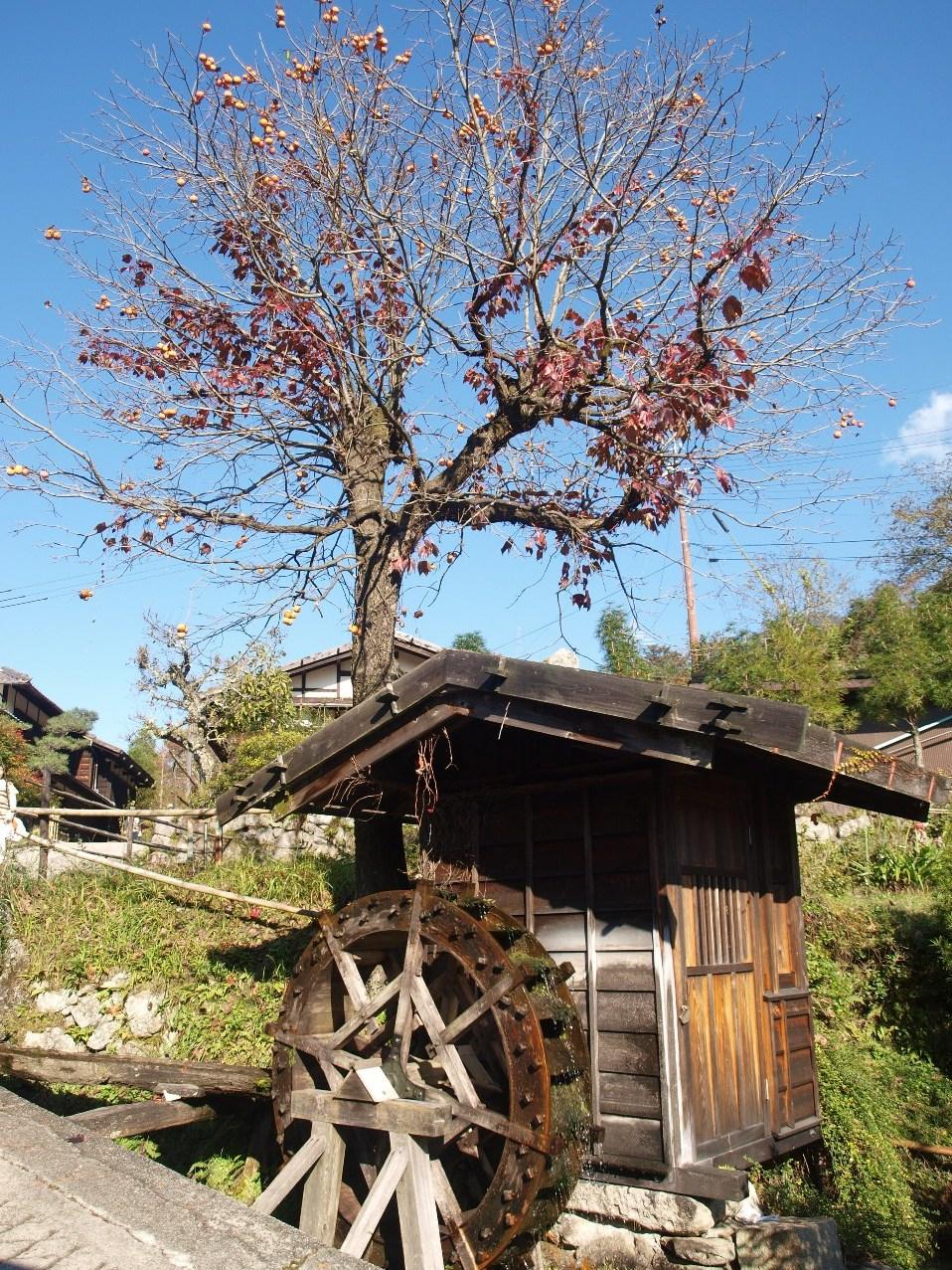 小さめのかわいらしい水車小屋です。後の柿の葉もだいぶ落ちて、秋も終盤なのでしょうか。