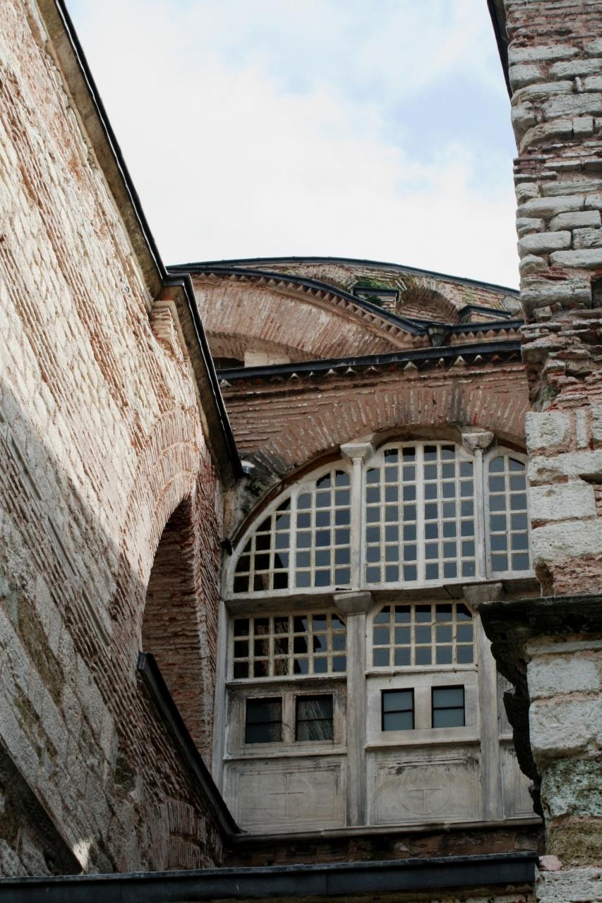 『現在のアヤソフィア(その7)』:プロコピオスによると、東側の大アーチの工事が完成しないうちにこれを支える主柱が外側に傾き始め、また、南と北のアーチは養生段階で下部のティンパヌムに過大な荷重をかけたため、窓の円柱か2階廊下の円柱が破壊し始めました。それでも、巨大なバットレスをドーム直下にまで補強するなどの方法により、高さ41.5 mのドームは建設されました。工事は5年11か月という短期間で終了し、 537年12月27日、ユスティニアヌス帝を迎え、総主教メナスによる献堂式が行われました。ユスティニアヌス帝は『ソロモンよ、余は汝に勝てり!』と叫んだと伝えられています。(同上)