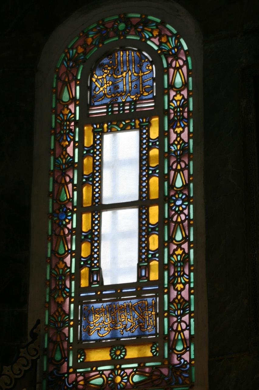 『現在のアヤソフィア(その13)』:このステンドグラスも、中央部分が空白になっていましたが、その上半円形と、下部の横長の長方形部分には、アラビア文字が記されているようでした。周辺の濃い色のステンドグラスに比べますと、随分と薄い色ですから、後年の細工かも知れません。明らかにオリジナル部分と比べて、材質・技法が異なっているように見受けました。周辺部分がオリジナル部分であることは、装飾の密度、デザインの統一性からみて、間違いないようです。(同上)