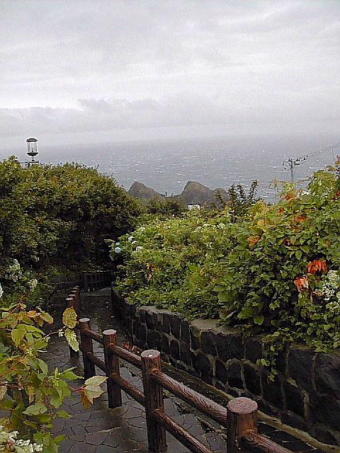 前兆338.2m、363段の階段だそうです。あじさいが綺麗に咲いていました。もちろん強い風が吹いていて遠くに見える海も荒れていました。