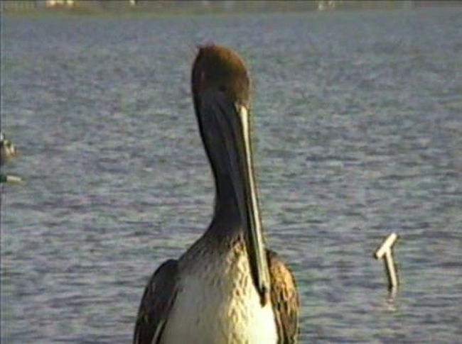 宿の前ではペリカンが海の上に出た細い棒の上に上手にとまって羽を休めています。