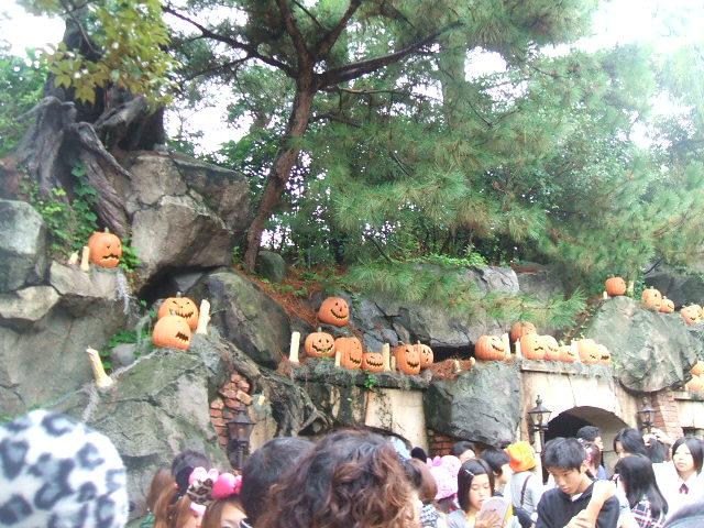 スプラッシュマウンテンのファストパスを取った後、まずは一度も行ったことがない(クリスマスシーズン含め)ホンテッドマンションのナイトメアバージョンに並びました。60分待ちでしたが実際は30分から40分くらい待ちました。その待ちレーンにあるカボチャたちです。