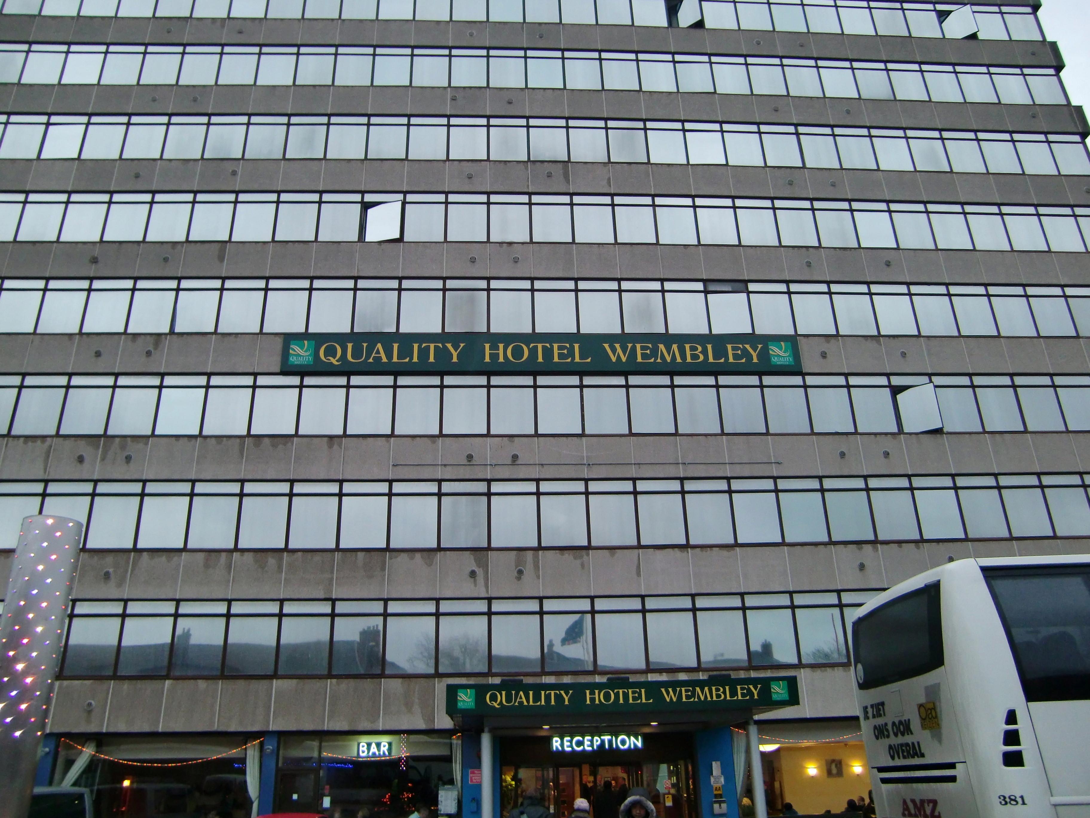 去年も宿泊したクオリティ・ウェンブリーですが、窓ガラスがミラータイプになっていて、ホテル名の看板もかなり控えめなので、遠くから見るとオフィスビルのように見えます。夜であれば、屋上に設置してあるネオンサインでホテルだと一発で分かると思いますが・・・