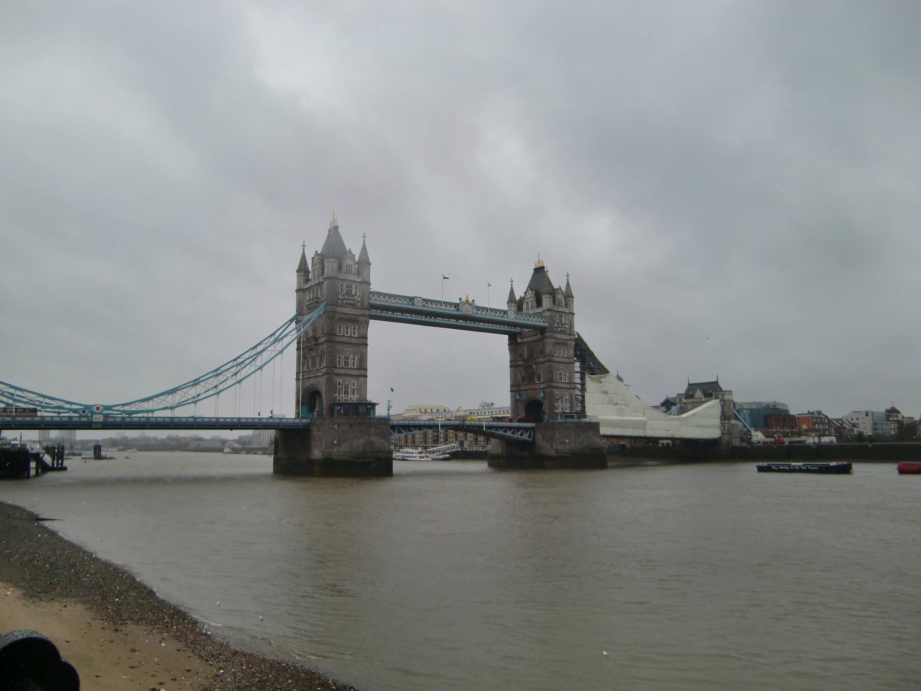 ロンドン塔はイースト・エンドと呼ばれる地区にあり、すぐ横にはテムズ川が流れています。テムズ川に掛かっているタワー・ブリッジは現在補修工事をしているようで、一部が足場に覆われていました。水面の方を見てみると、この辺りは海水も流れてきているのか、岸辺は小石混じりの砂浜になっていました。