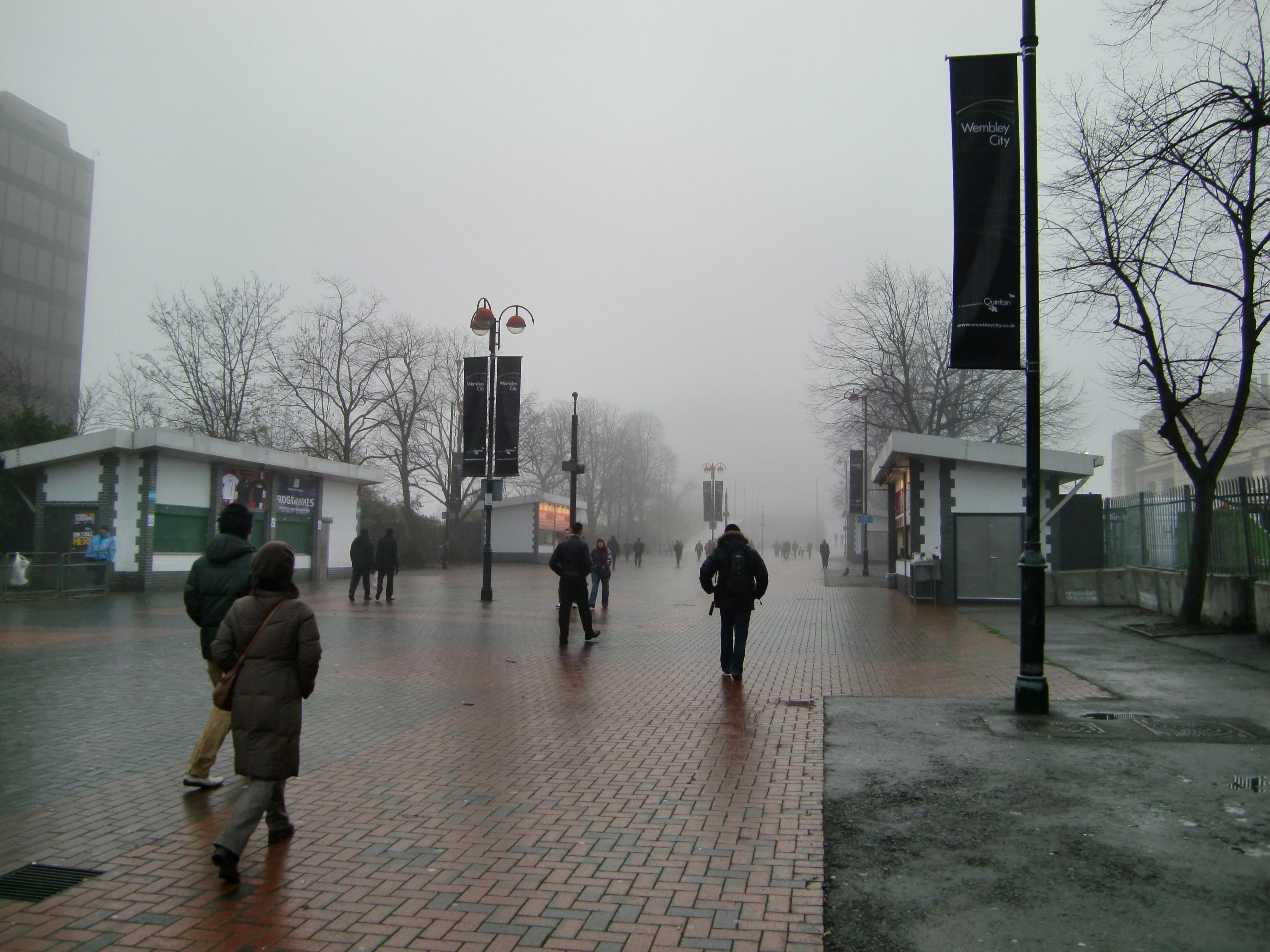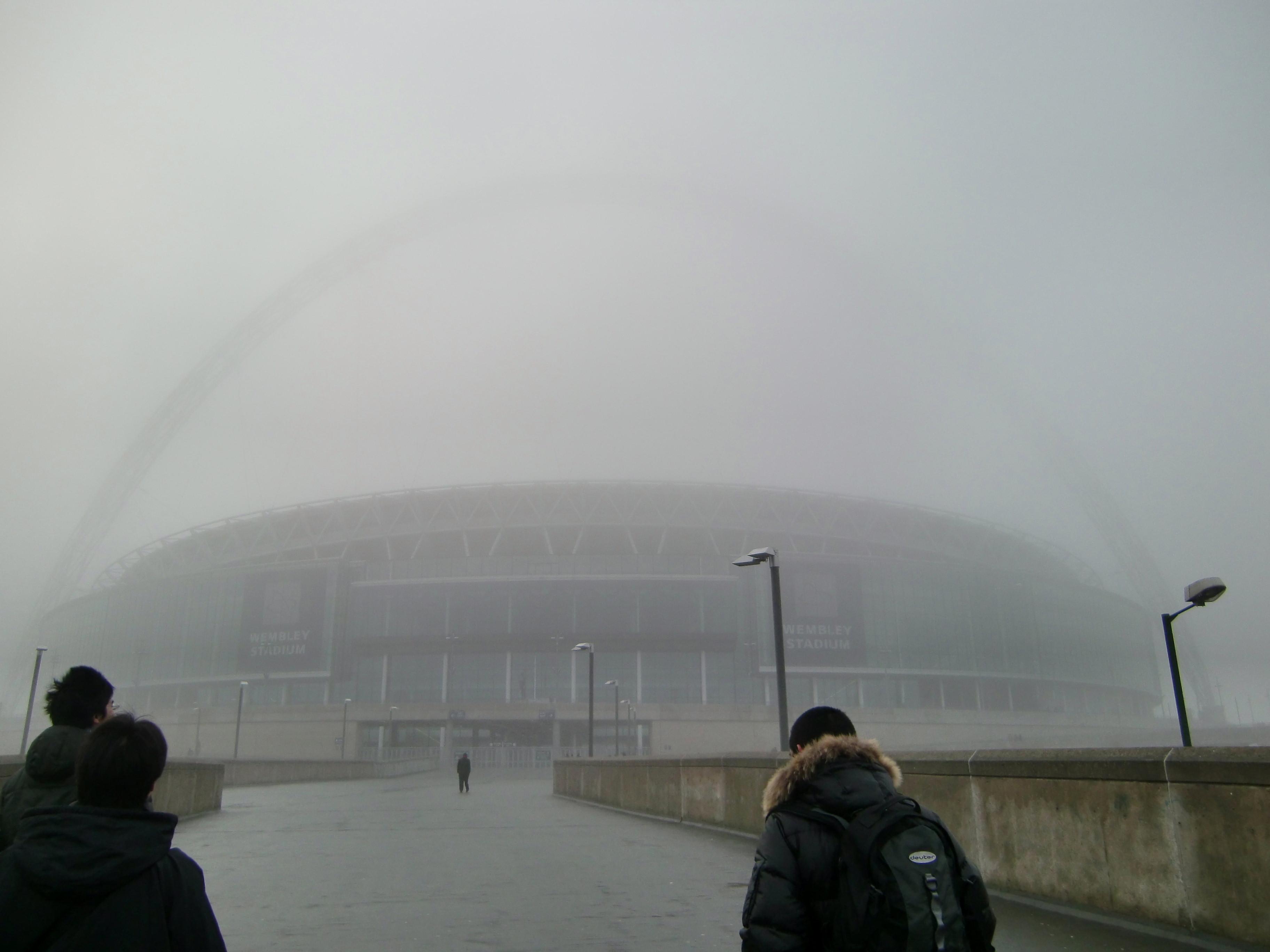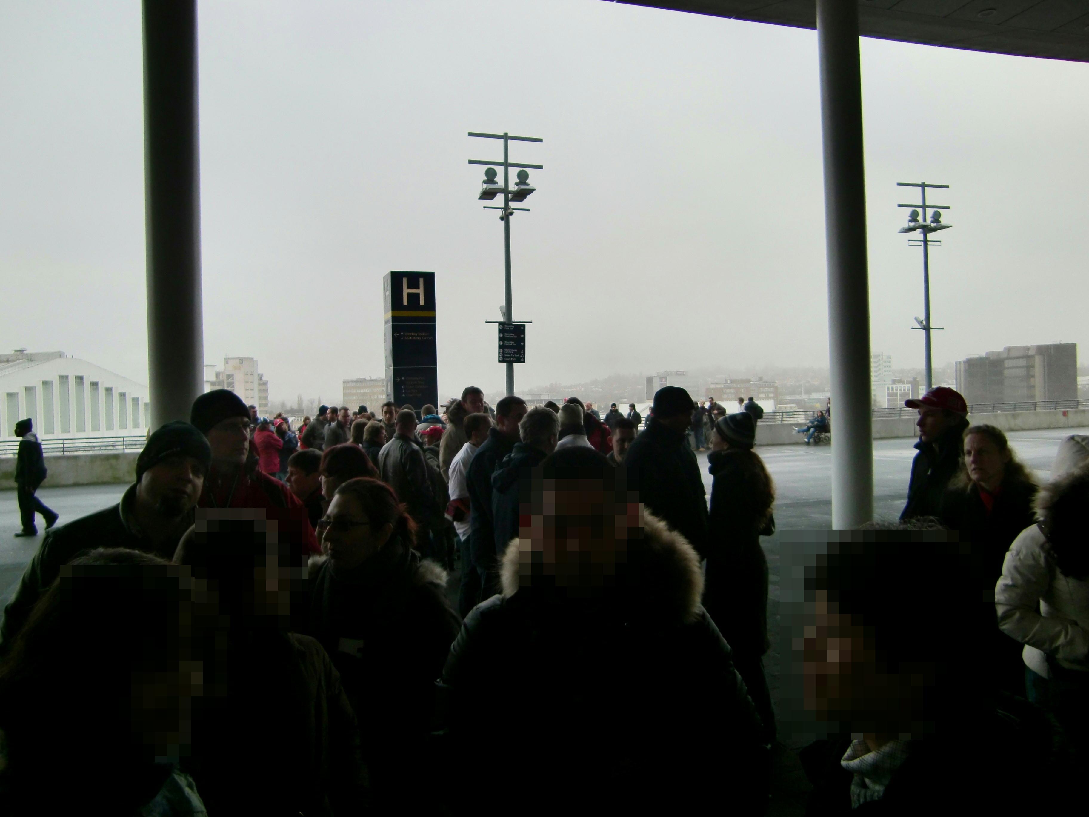 スタジアムまであと少しと言うところまで近づいて、ようやくスタジアムの姿が見えてきました。ウェンブリー・スタジアムは観客席には屋根があるものの、ドーム状のスタジアムではないので、現在上がっている雨がそのまま降らなければ良いのですが・・・