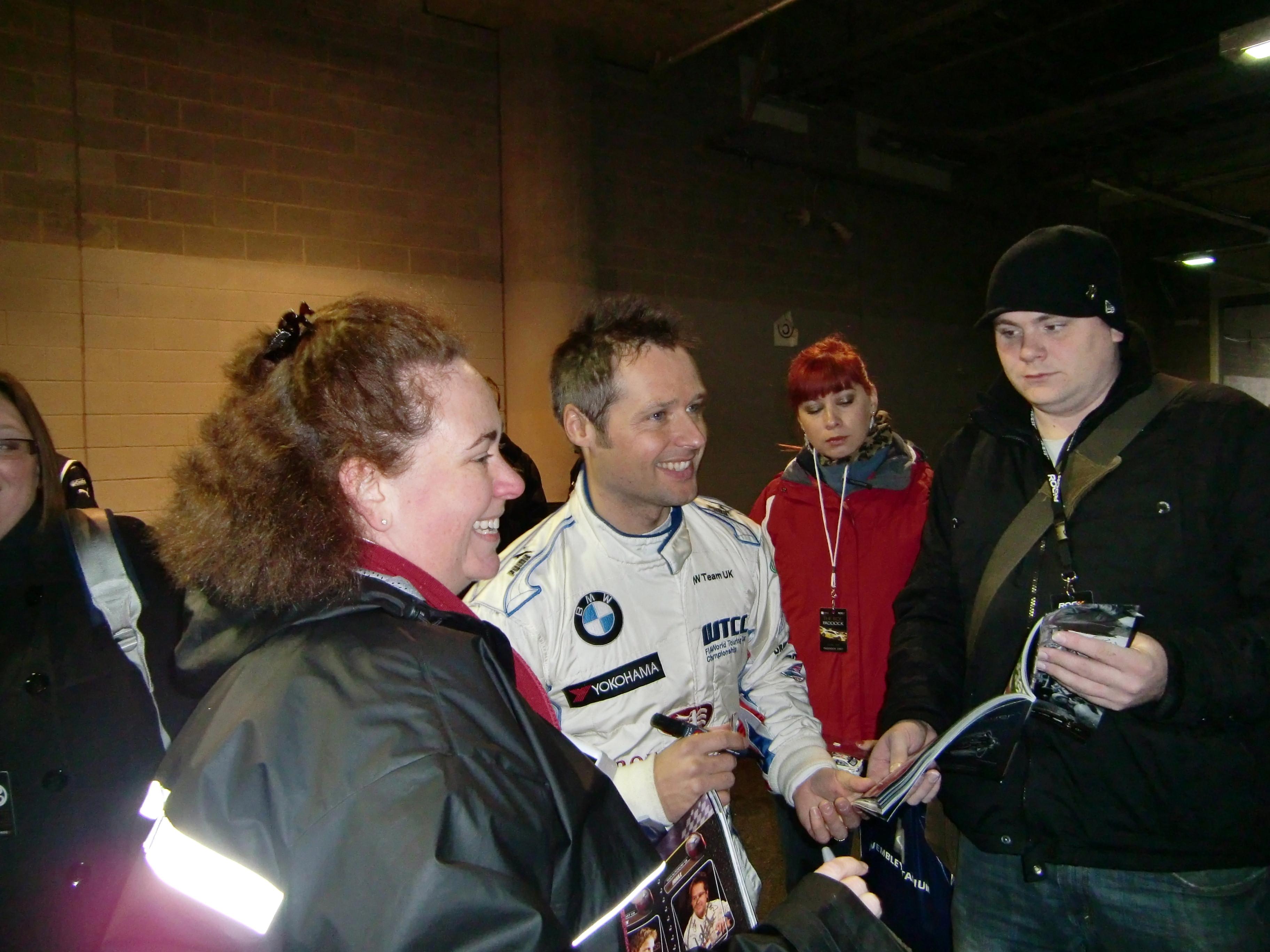 次にローブを見つけたので写真を用意していると、その間にどこかに行ってしまったようで、姿が見えなくなっていました。そのすぐ近くにはバトンがいて、バトンにはサインを貰うことが出来ました。その後は先程写真に撮ったBMWのそばにプリオールがいたので、去年のレースオブチャンピオンズの時に撮った写真にサインを貰いました。サインを貰うときに、この写真は去年撮ったものだという話をして、握手もして貰いました。