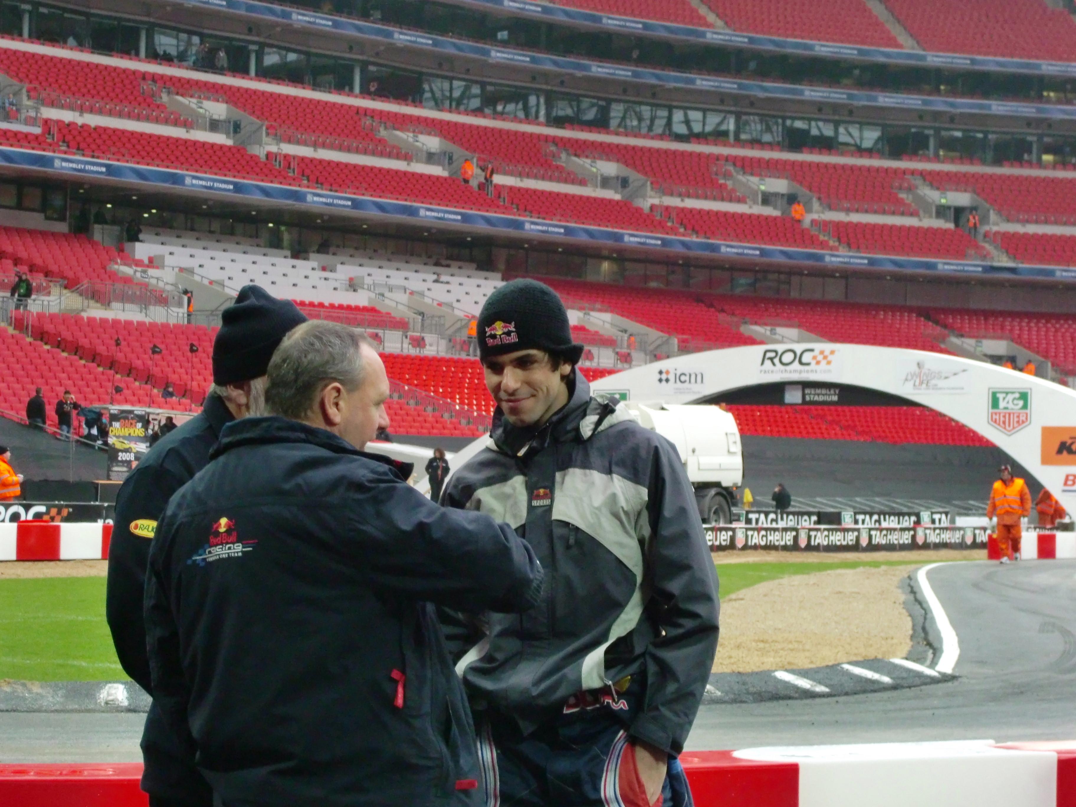 再び外へ出てみると、F1マシンの前に行列が出来ています。列の先頭を見てみると、クルサードとベッテルがサインをしていたので、残りの時間を気にしながらも列の最後尾に並びました。列の先頭の方を見ていると、レッドブルのレーシングスーツを着ている人がクルサード、ベッテルと話し込んでいたので、誰だろうと思って写真を撮ってみました。この人は後で分かったのですが、怪我で欠場したウェバーの代わりに出場した、今年の英国F3チャンピオンのスペイン人ドライバー、ジェイミー・アルグエルスアリでした。