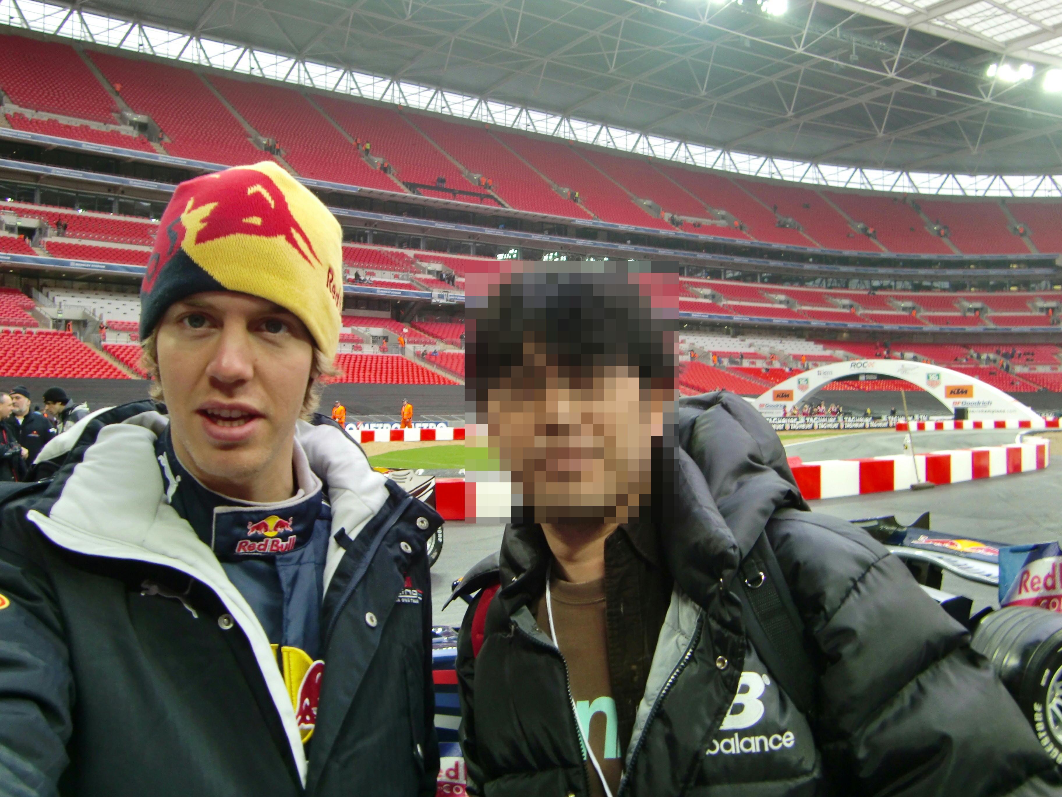 パドック・ビジットは1時間しかないので、残り時間を気にしながら列が進むのを待っていました。ようやく列の先頭まで来て、まずクルサードにサインを貰って、ベッテルにはサインを貰った後に一緒に写真も撮りました。この時にはベッテルの直筆サインが入った、ベッテルがドライブするレッドブルのマシンのカードも貰いました。