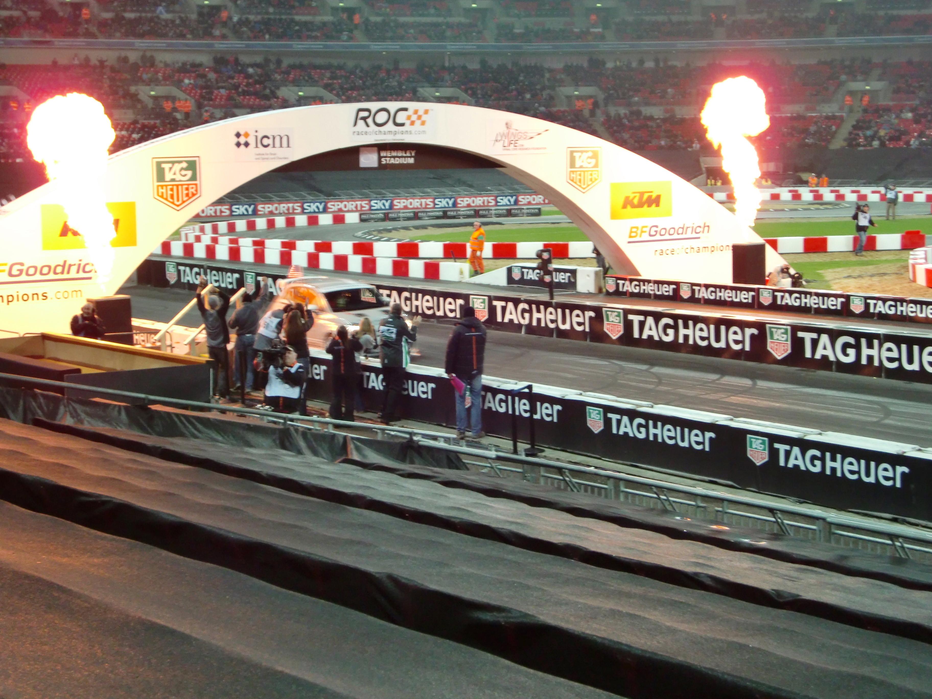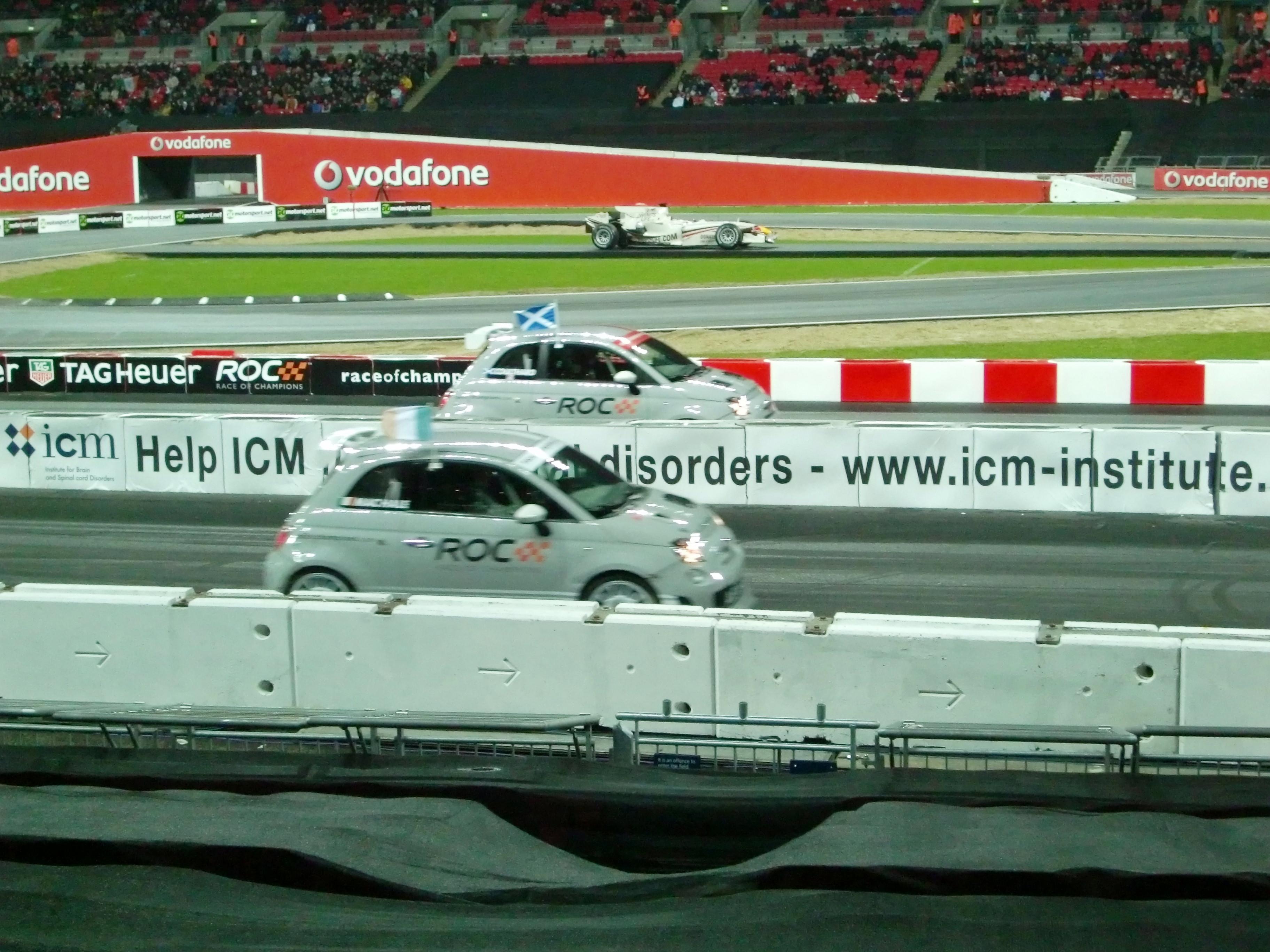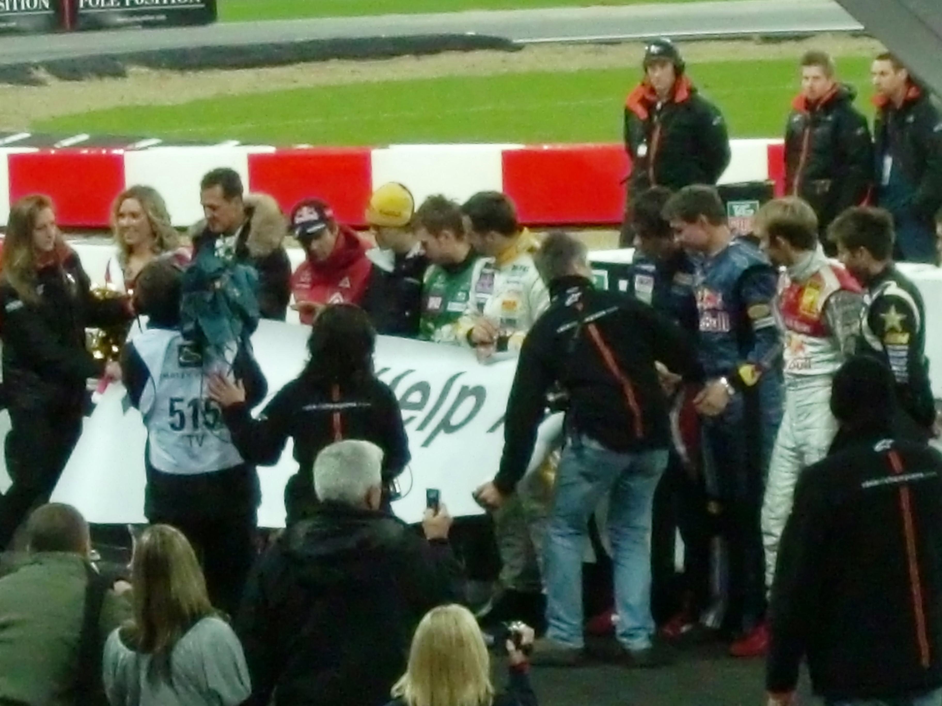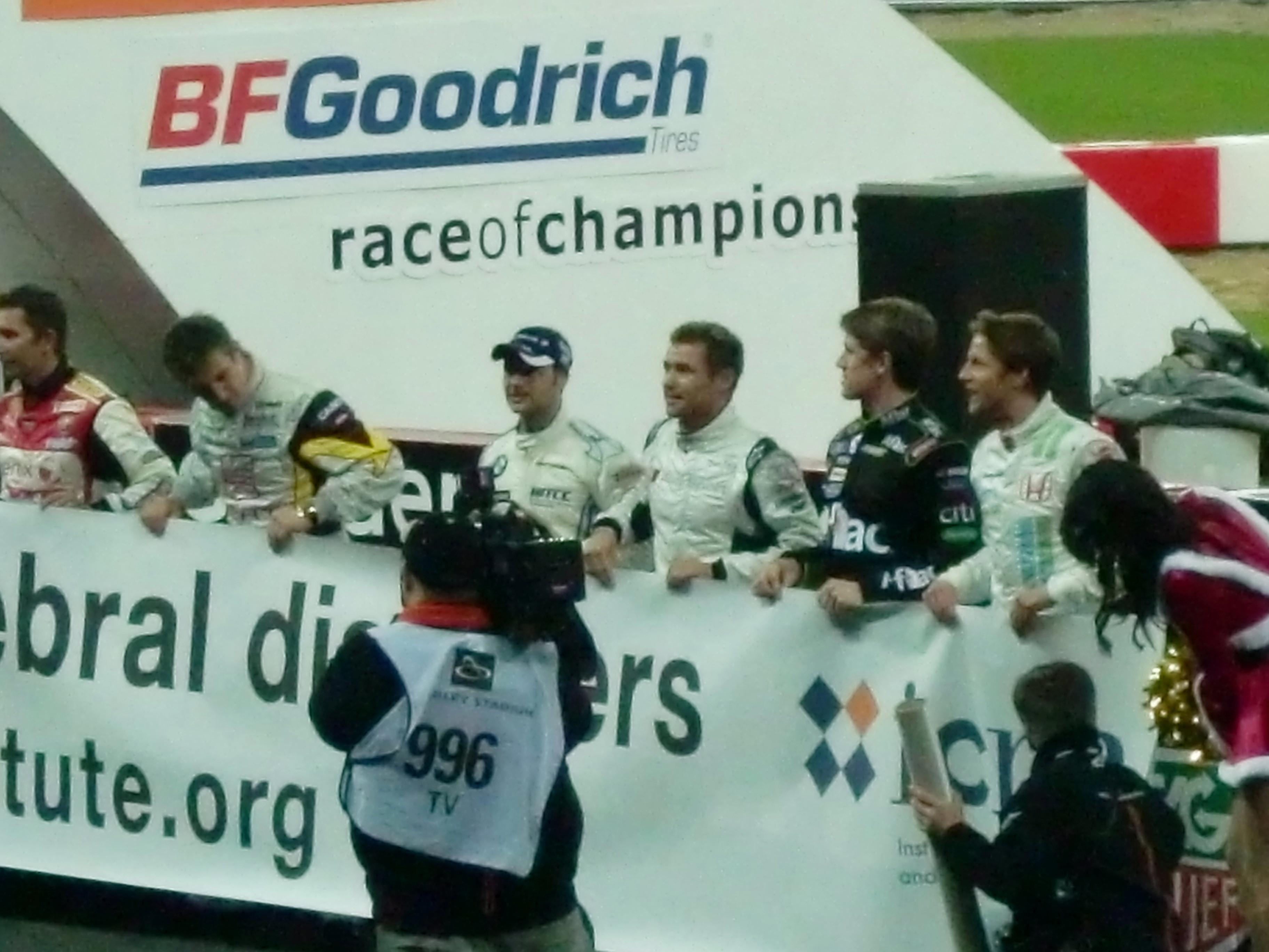 レースオブチャンピオンズが始まる前には、出場ドライバーが1人ずつ観客の前に出てきます。コンパクトデジカメでの写真なので、かなり画質が悪いですが、写っているのは左からM.シューマッハ、S.ローブ、S.ベッテル、A.キャロル、Y.ミューラー、J.アルグエルスアリ、D.クルサード、M.エクストローム、T.フォーストです。
