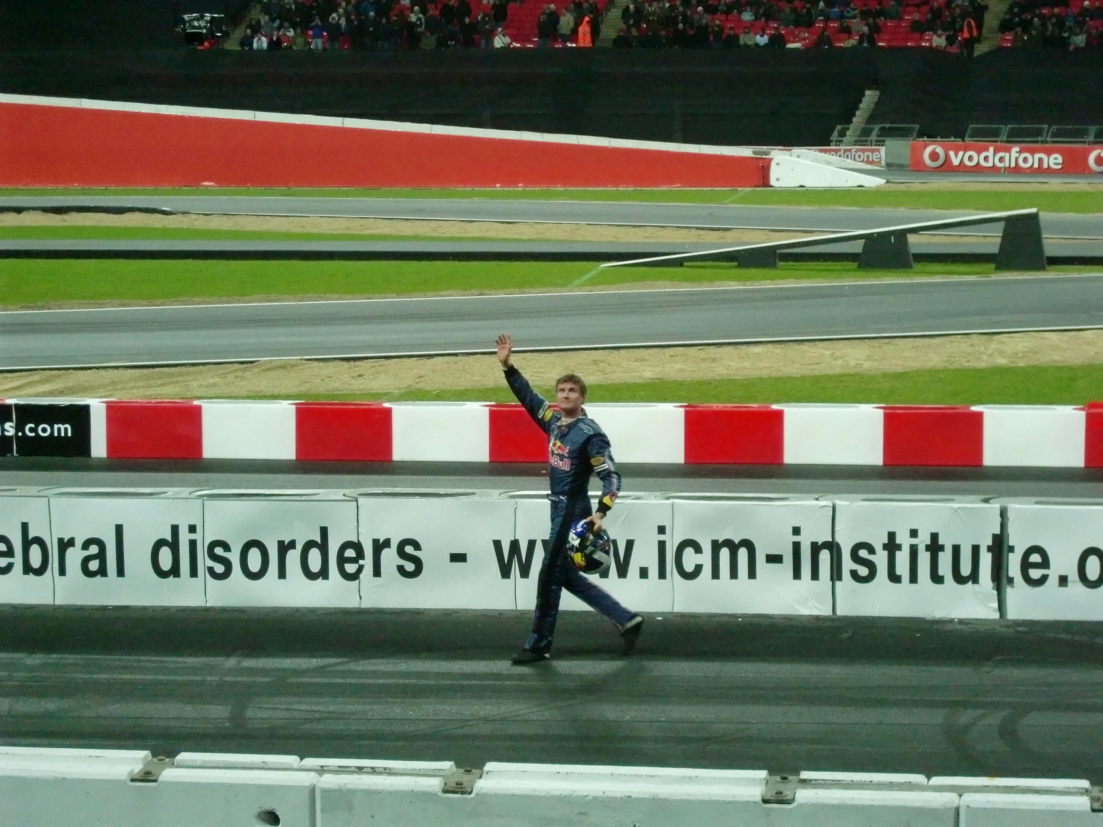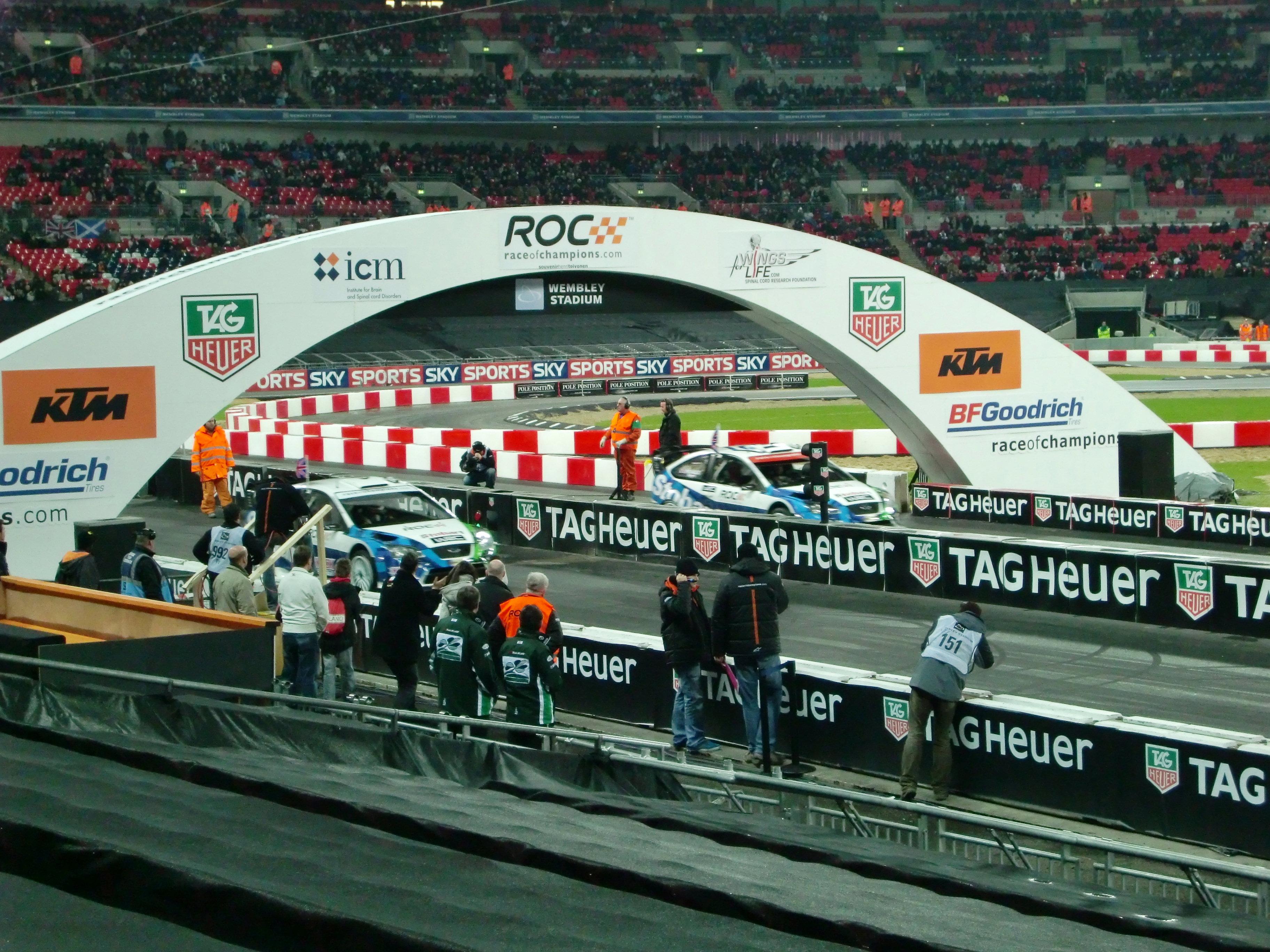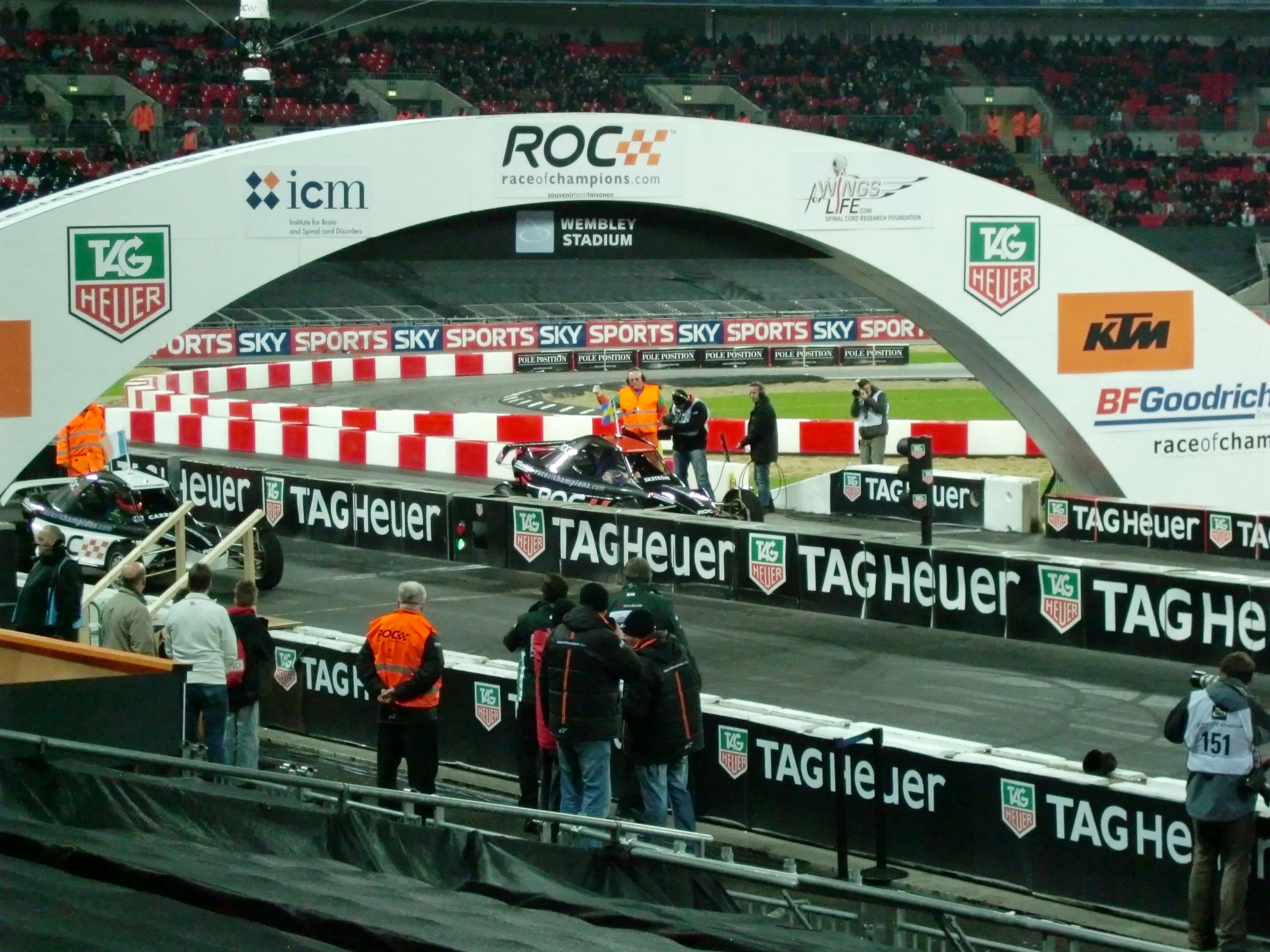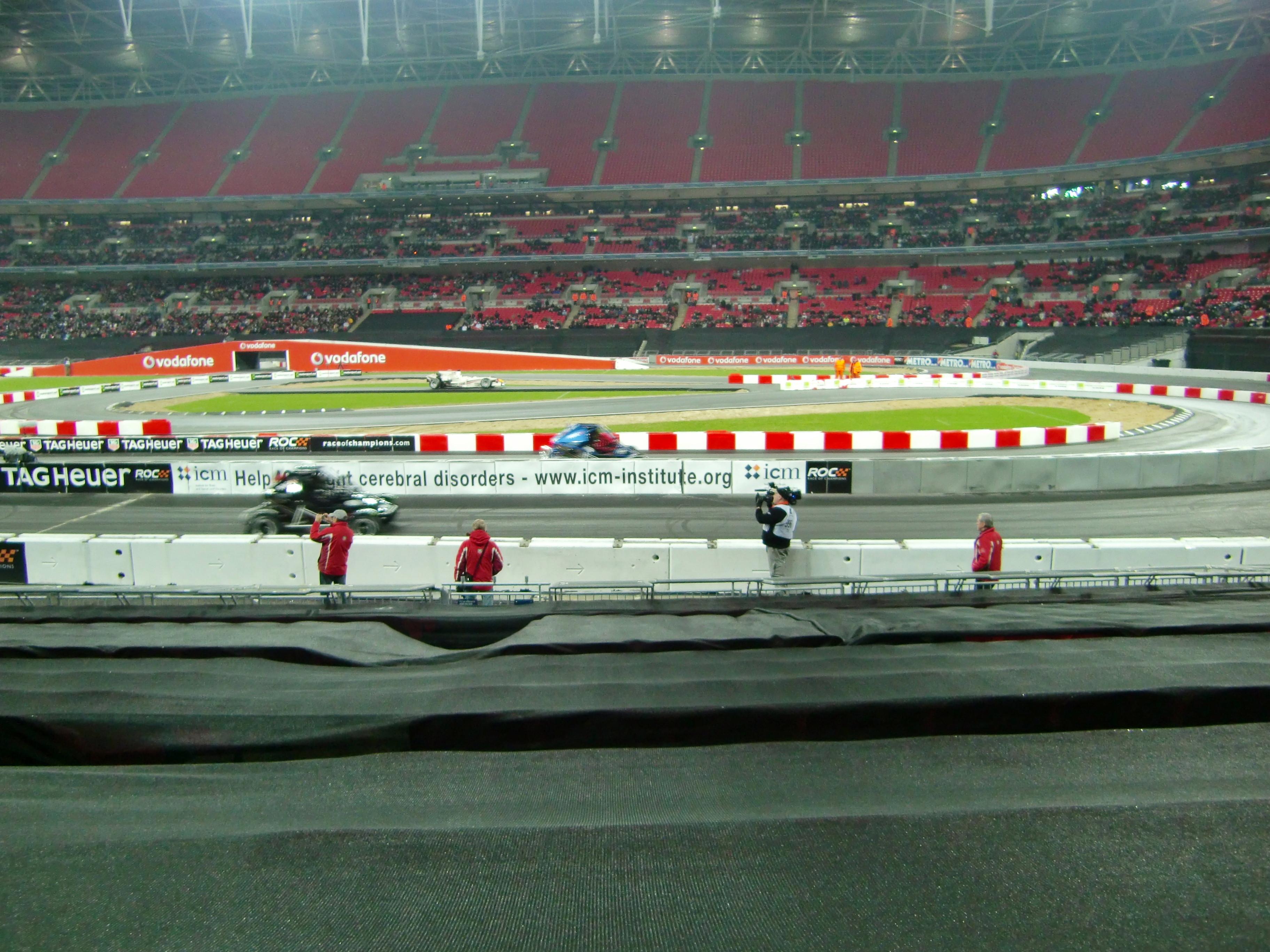 レースオブチャンピオンズが始まる前には、出場ドライバーが1人ずつ観客の前に出てきます。コンパクトデジカメでの写真なので、かなり画質が悪いですが、写っているのは左からM.シューマッハ、S.ローブ、S.ベッテル、A.キャロル、Y.ミューラー、J.アルグエルスアリ、D.クルサード、M.エクストローム、T.フォーストです。