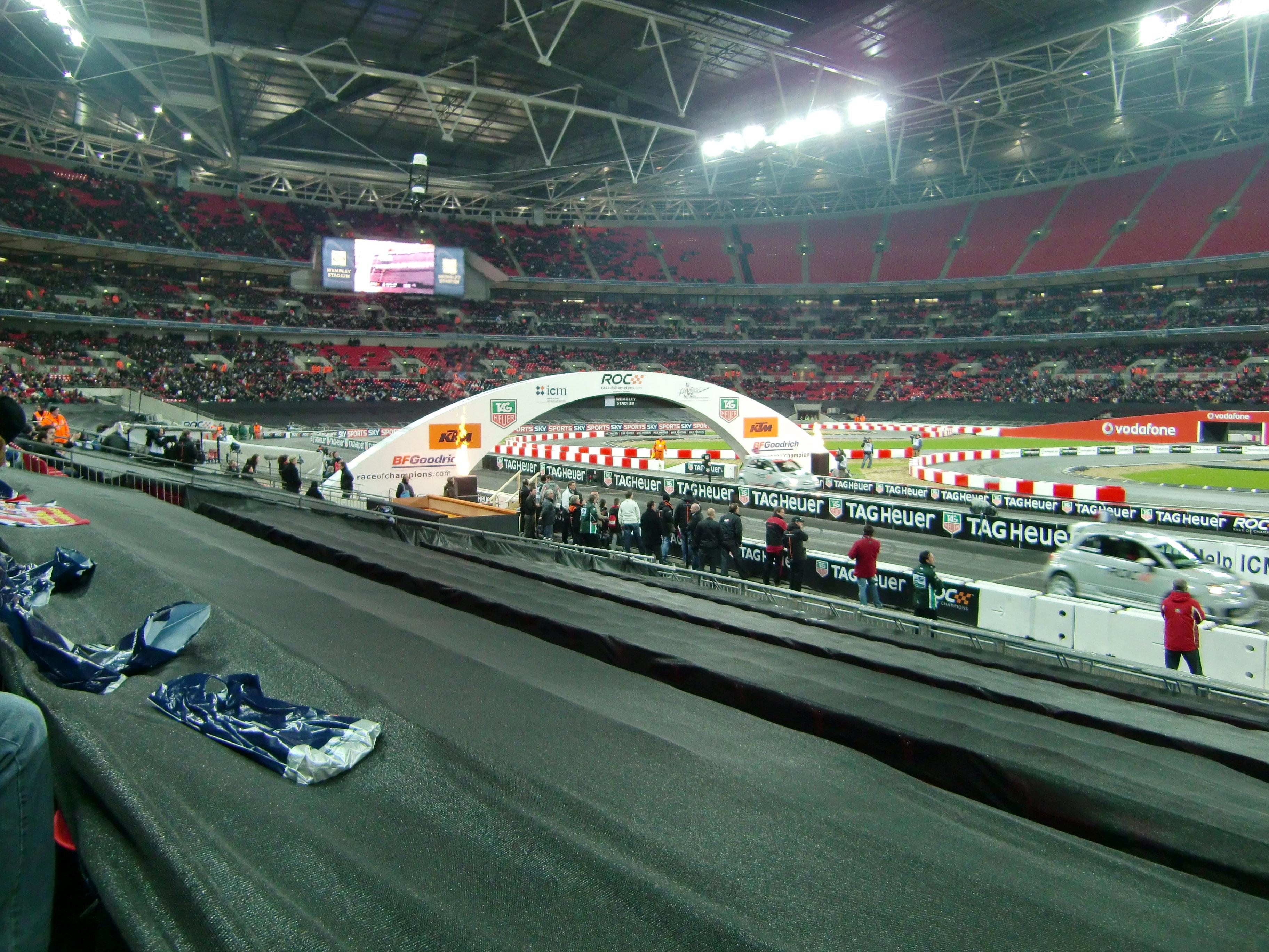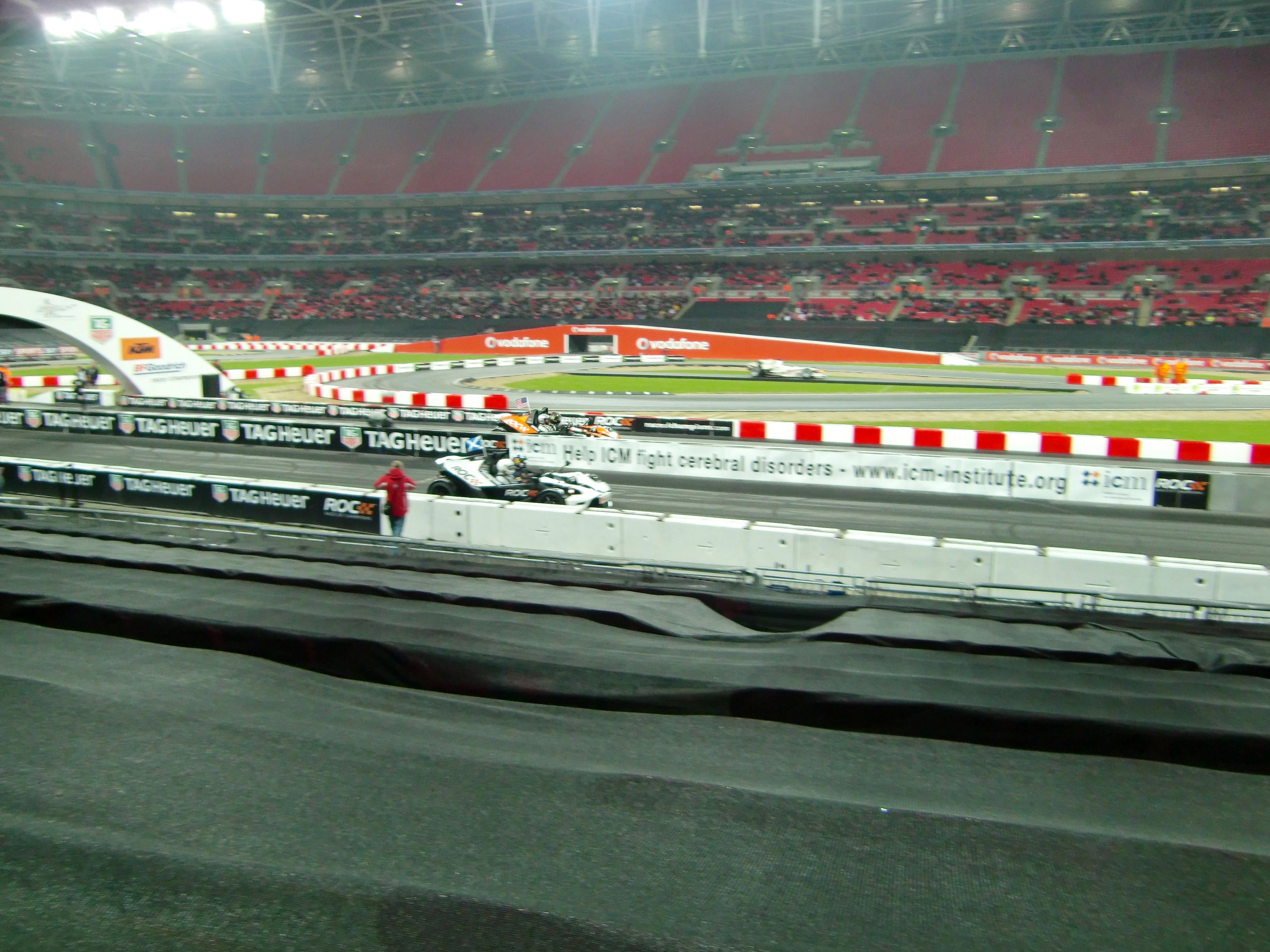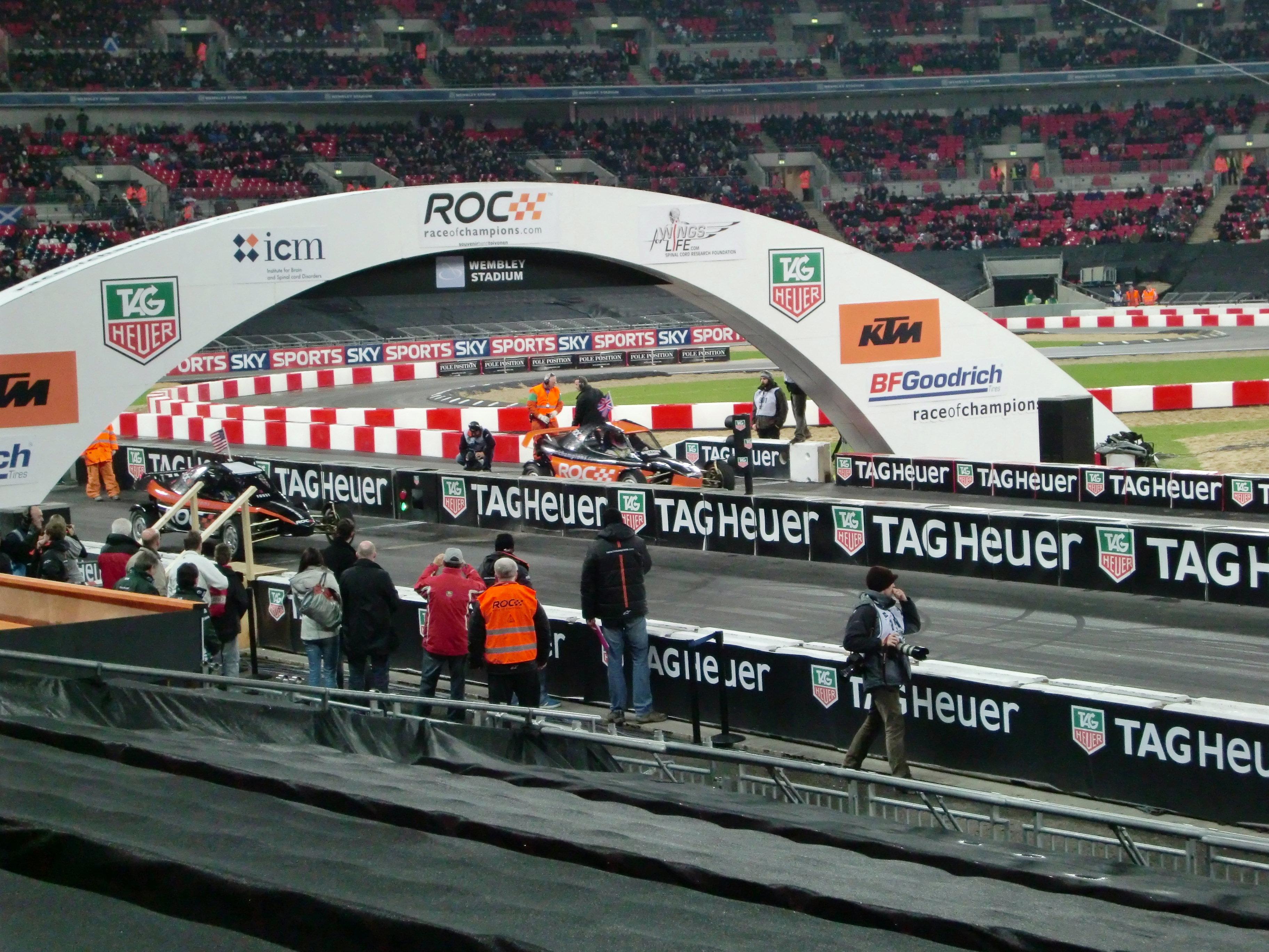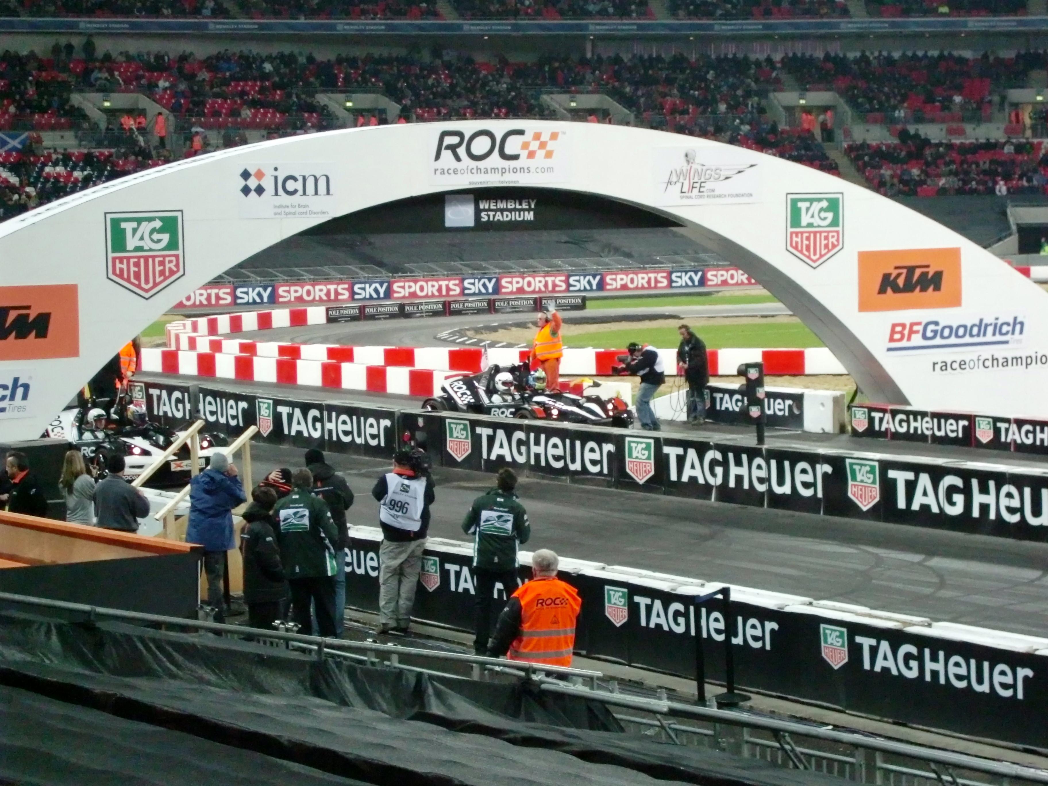 レースオブチャンピオンズが始まる前には、出場ドライバーが1人ずつ観客の前に出てきます。コンパクトデジカメでの写真なので、かなり画質が悪いですが、写っているのは左からM.シューマッハ、S.ローブ、S.ベッテル、A.キャロル、Y.ミューラー、J.アルグエルスアリ、D.クルサード、M.エクストローム、T.フォーストです。