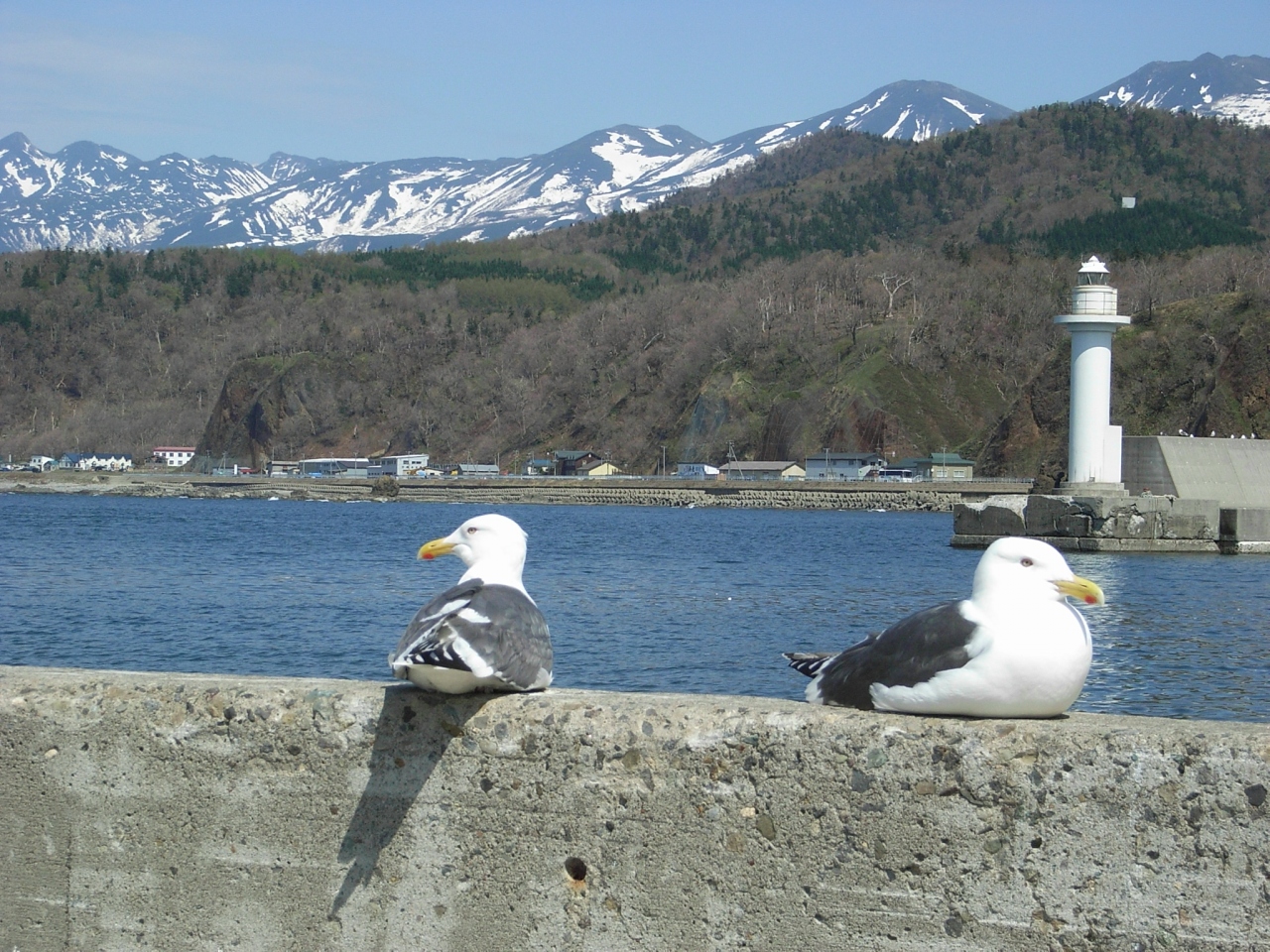 2006年11月に妻と道東の格安ツアーに参加した時、知床で行ったところはオシンコシンの滝のみ。その時、ウトロを通過した際、車窓から港方面に見えるに山のような大きな岩が印象的だった。ツアーでなければ、ウトロで降りて町を歩いて、大きな岩をいろいろな角度から見て、写真を撮ったり岩を登ったりしてみたいと思っていた。ということで今回はフリーなので好きなだけ時間をとりウトロを歩いた。晴れていたのでまだらに残雪がある知床の山々を見ながらのウォーキングは最高。車窓からでは見られなか