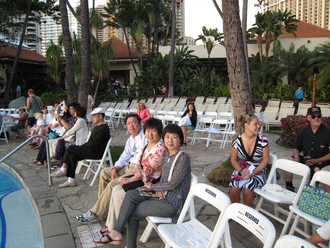 今までは後方より立ち見で(無料)しか見たことが無かったのですが・・・チケットはヒルトン滞在者優先で購入できます。その他の方は空きが有れば購入できます。 -