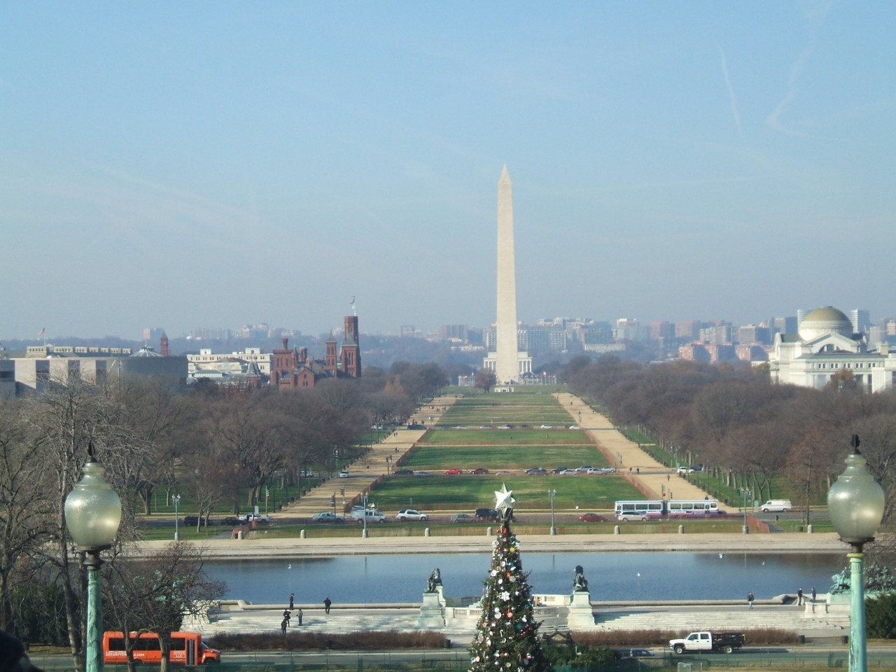 正面に見えるのはワシントン記念塔です。この周辺をモールといって左右に有名なスミソニアン博物館があります。 -